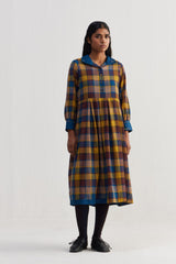 Round neckline sleeveless quilted dress with buttondown side seam placket.Constructed in checkered 100% merino wool. Finished with collage handblock print 100% silk fabric facing detail.