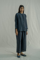 A stand collar, straight fit front open button down shirt with full sleeve. constructed in solid 100% linen fabric with contrast selvedge detail.