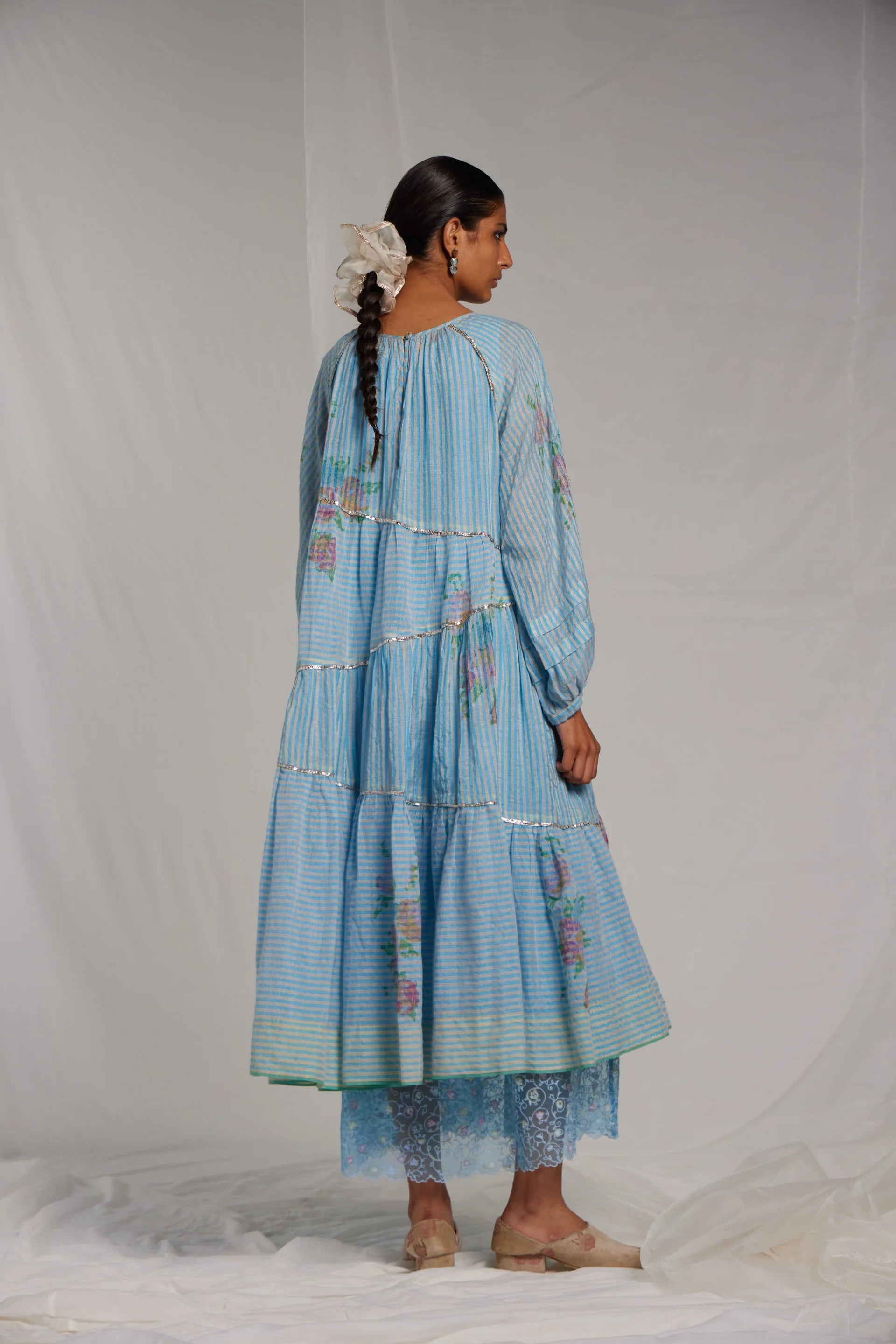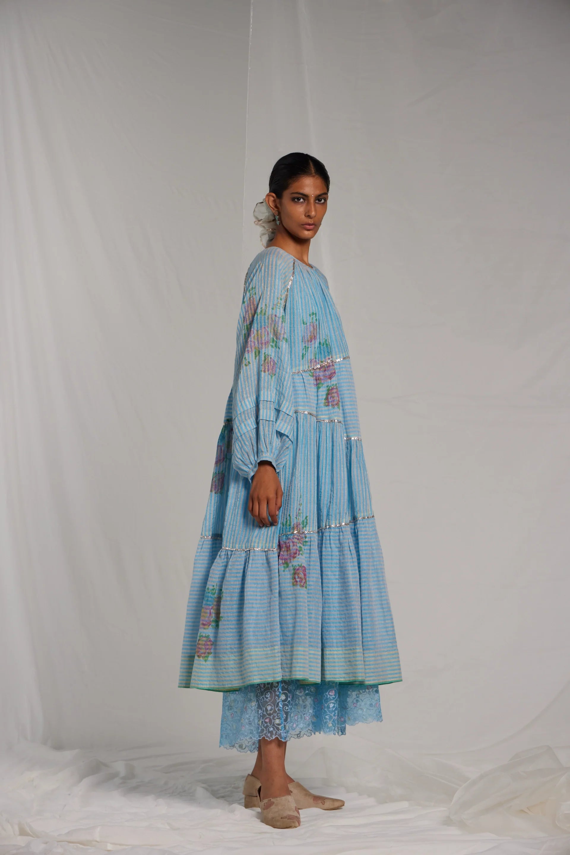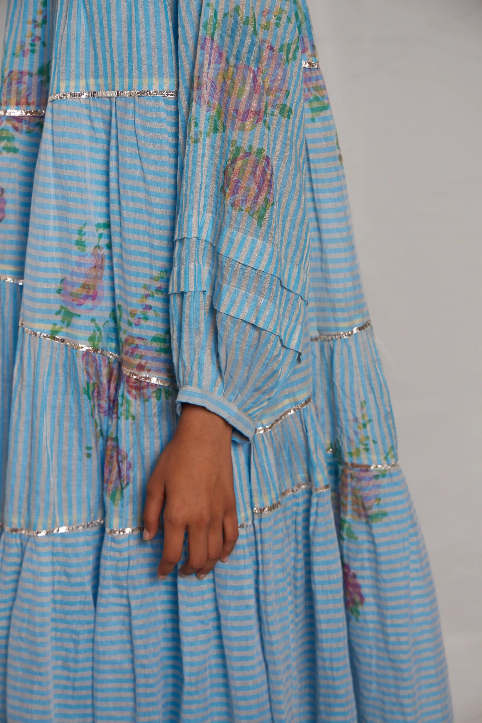 A-symmetrical tiered dress in handloom yarn dyed cotton silk and zari stripe with placement hand block print finished with metallic gota seam detailing on the tier seams. Fits away from the body flare midi length dress. Comes along with a separate cotton silk lining without trim.