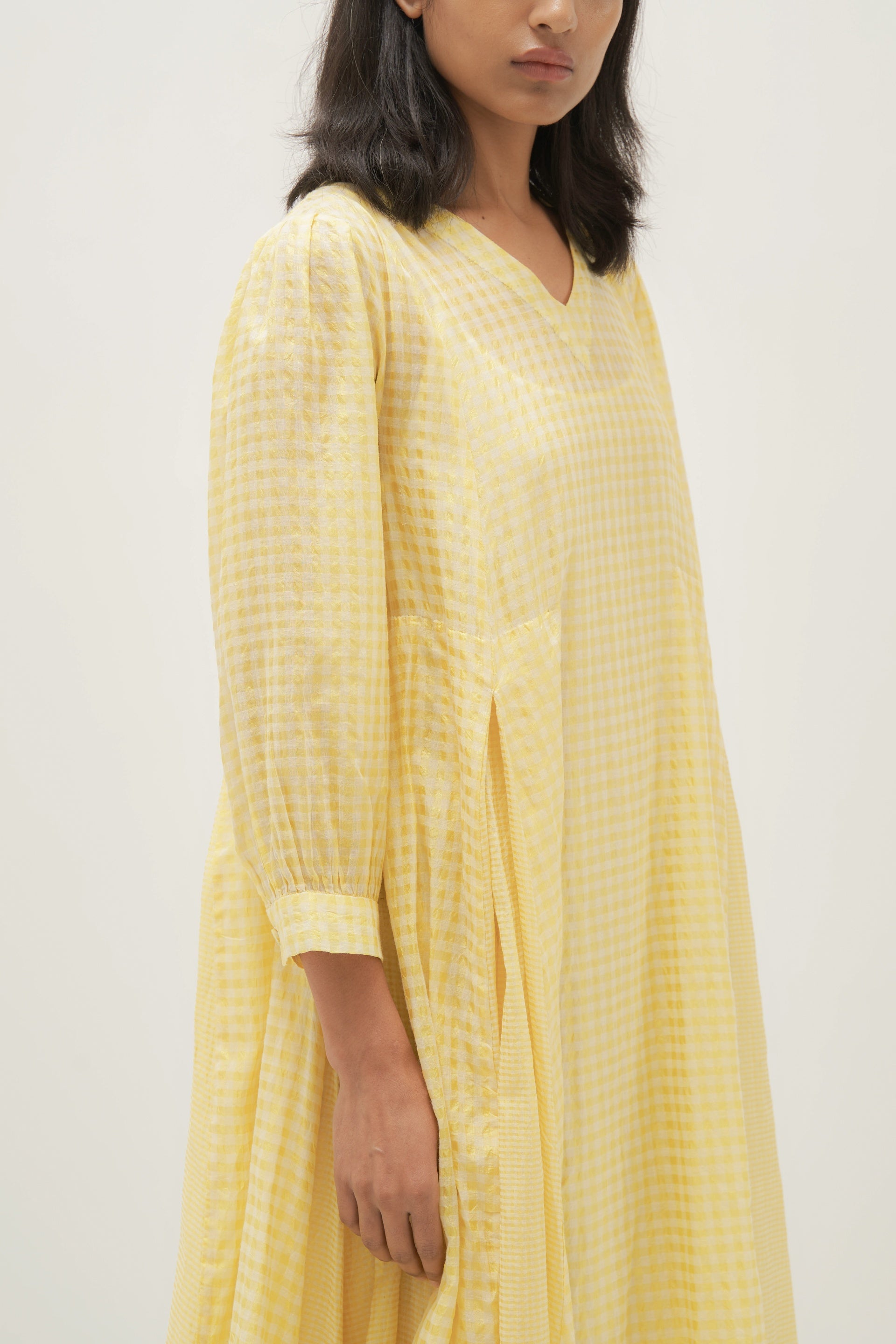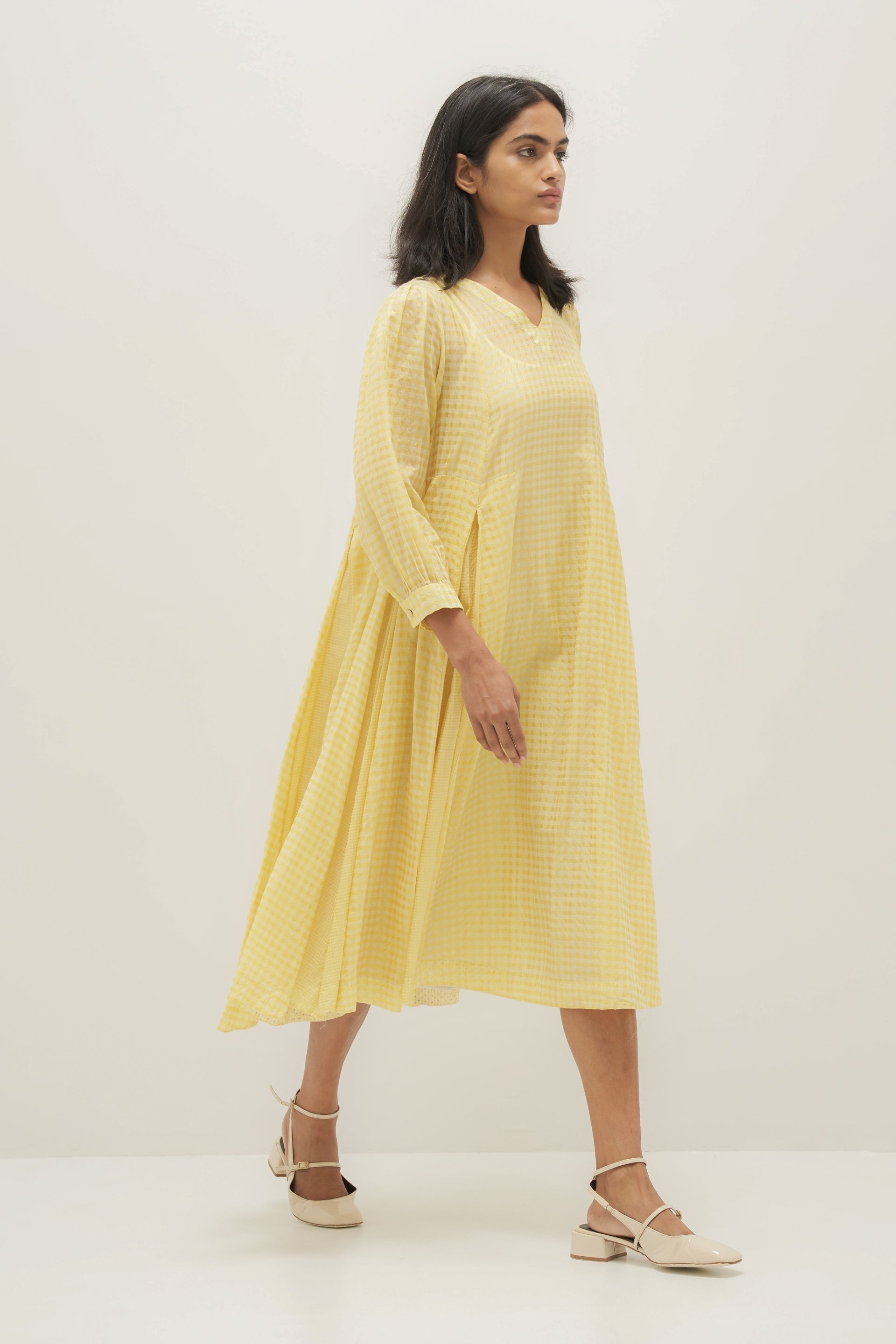 Checkered yellow dress in cotton silk handloom with alternate sized checks in inverted box pleats