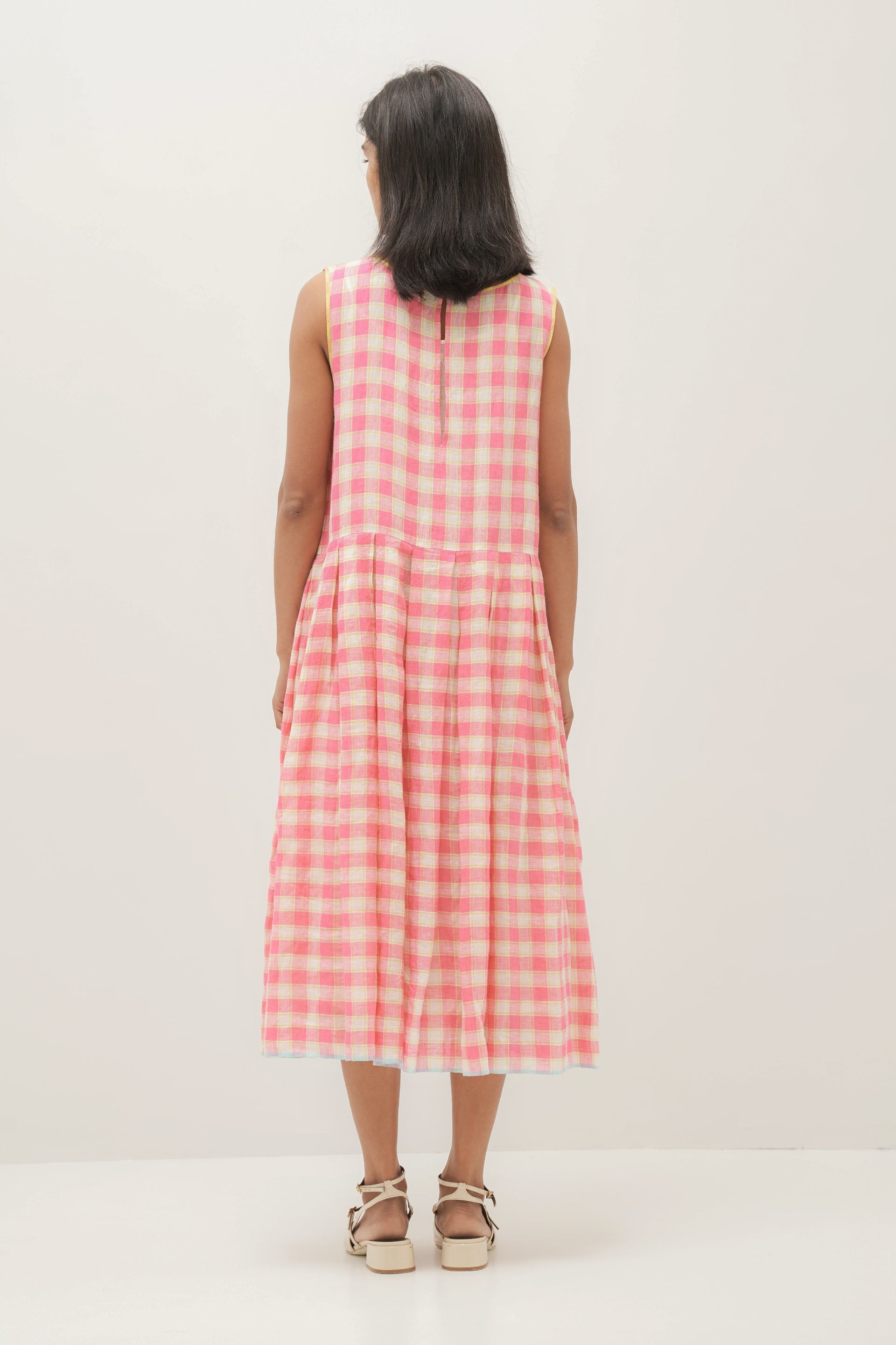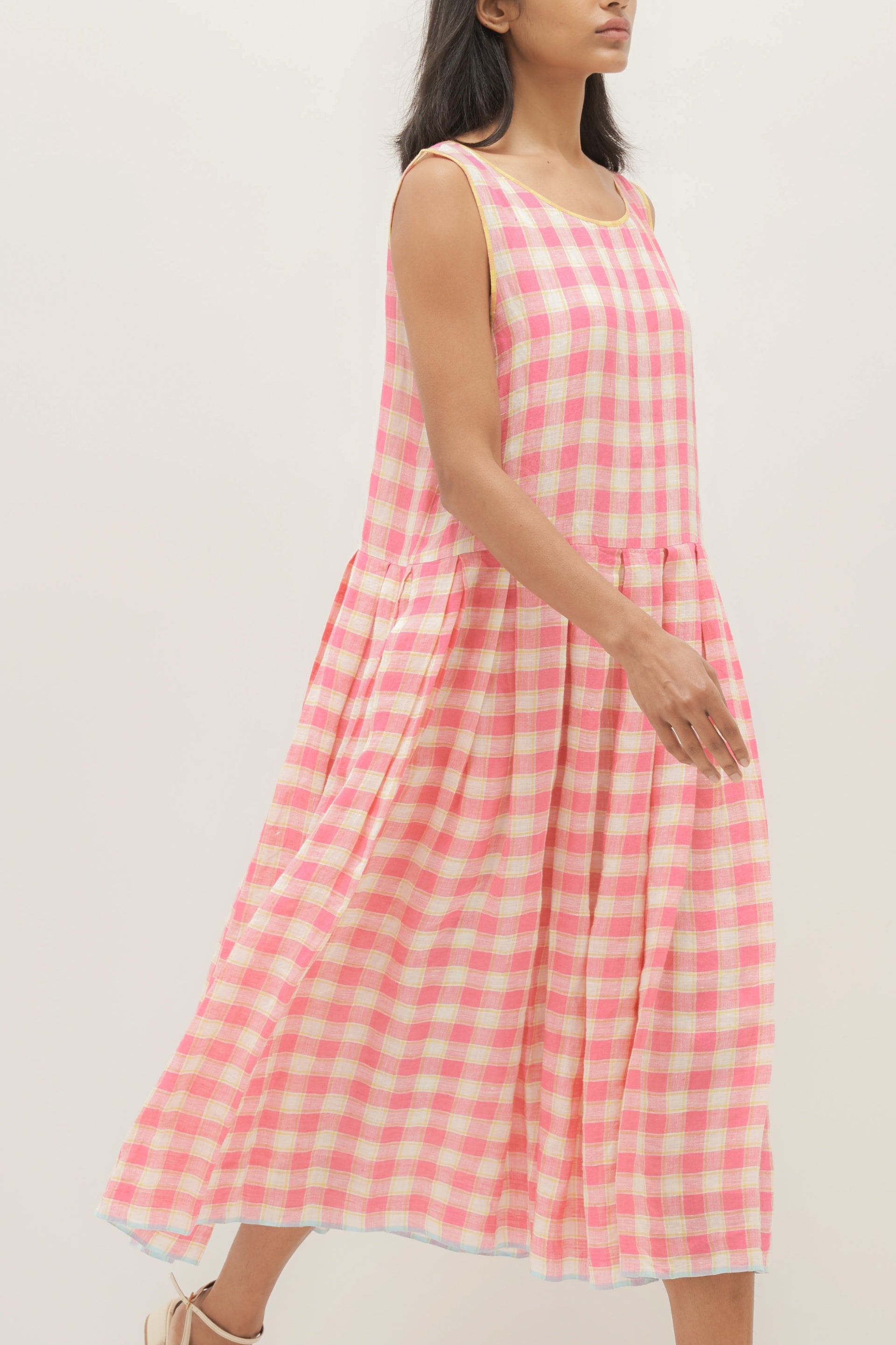 Sleeveless striper cherry dress in handwoven linen with contrast selvedge detail