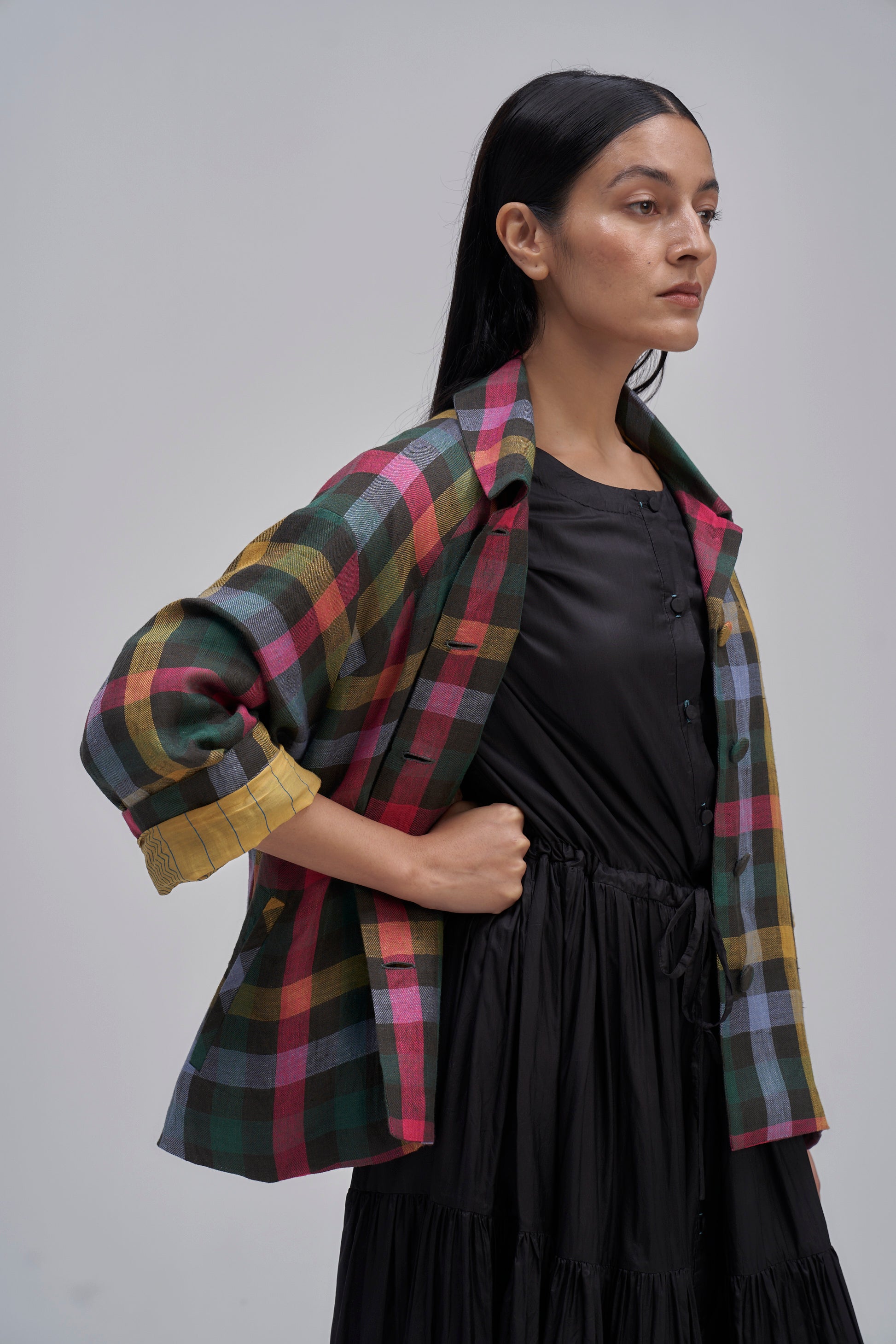 Flat collar baggy fit front open drop shoulder short cropped jacket with 3/4 baggy sleeve. Constructed in multicolor 100% linen twill fabric. Finished with attached contrast collage hand block print cotton silk lining detail.