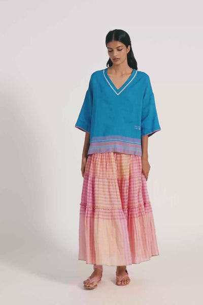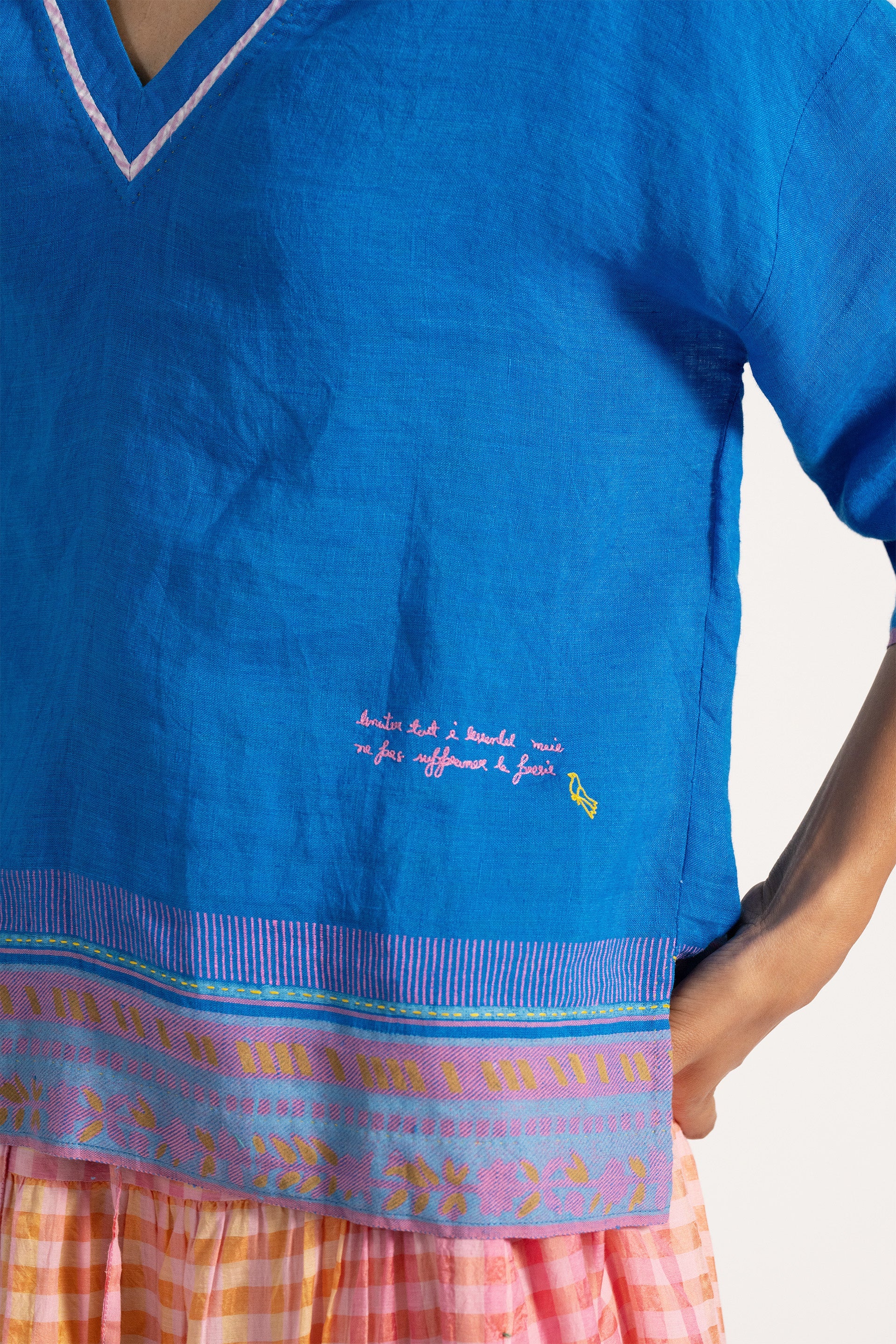 Basic v neckline relaxed fit top with 3/4 sleeve and contrast border and salvedge detail across the hem and sleeves. Constructed in solid with border 100% linen fabric.
