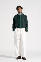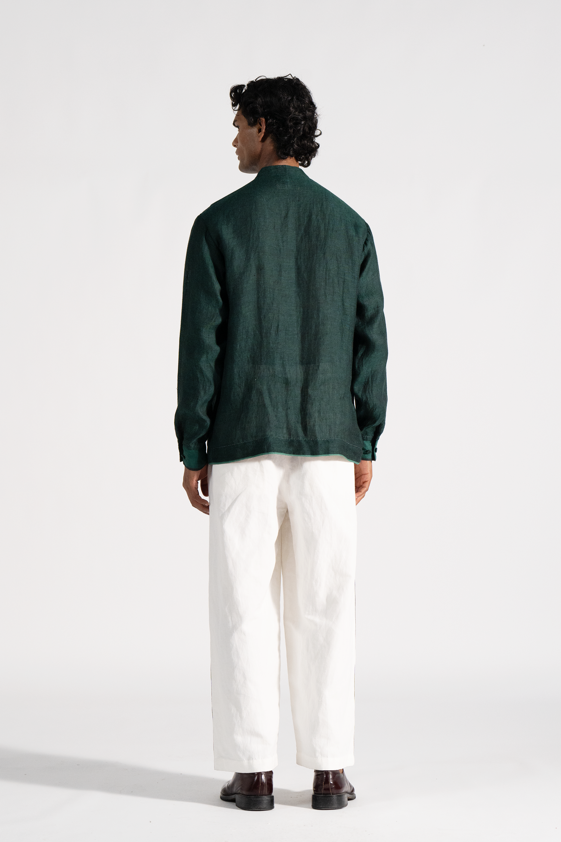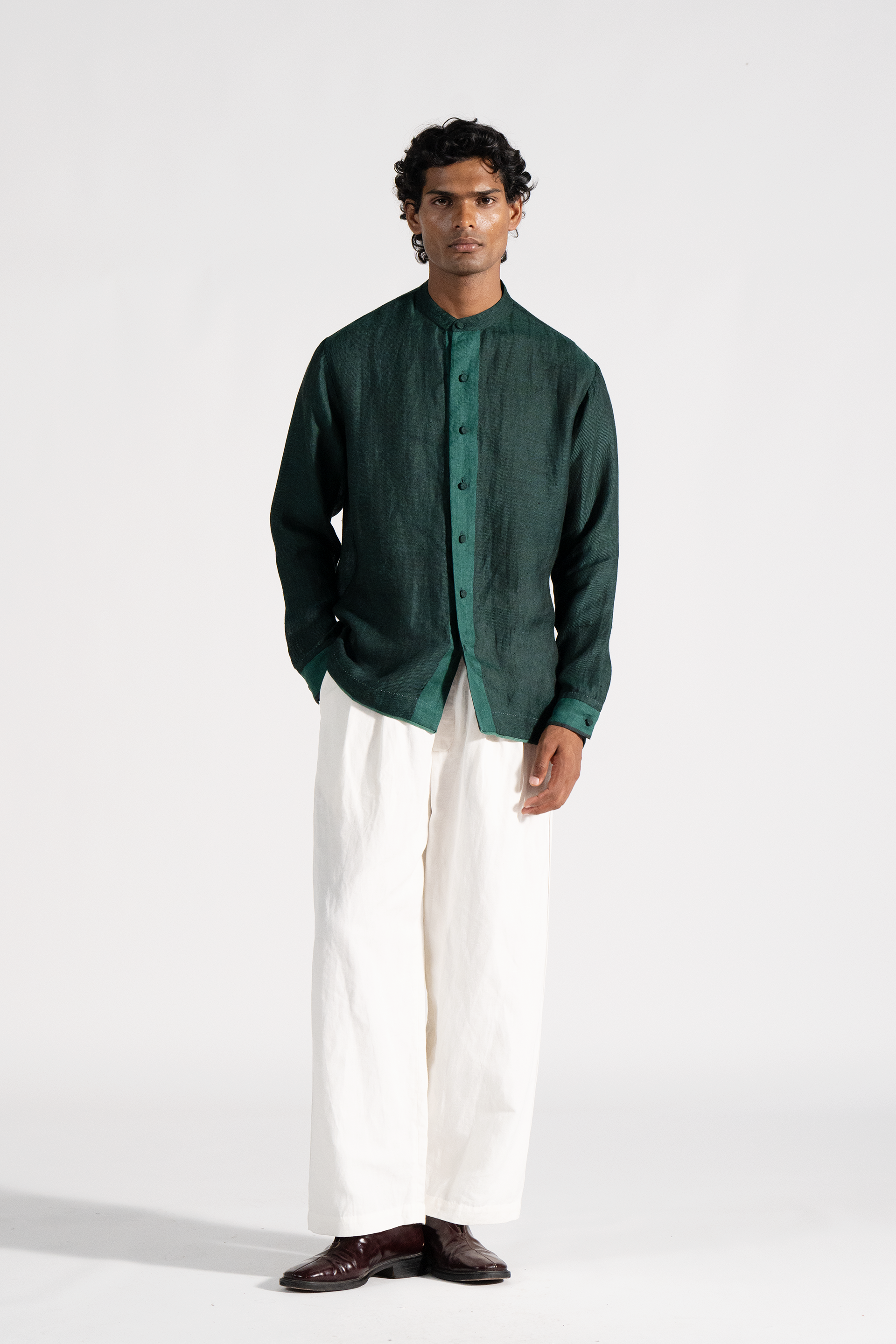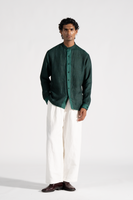 Mandrin collar straight fit button down full sleeve shirt with placket and cuff detail.