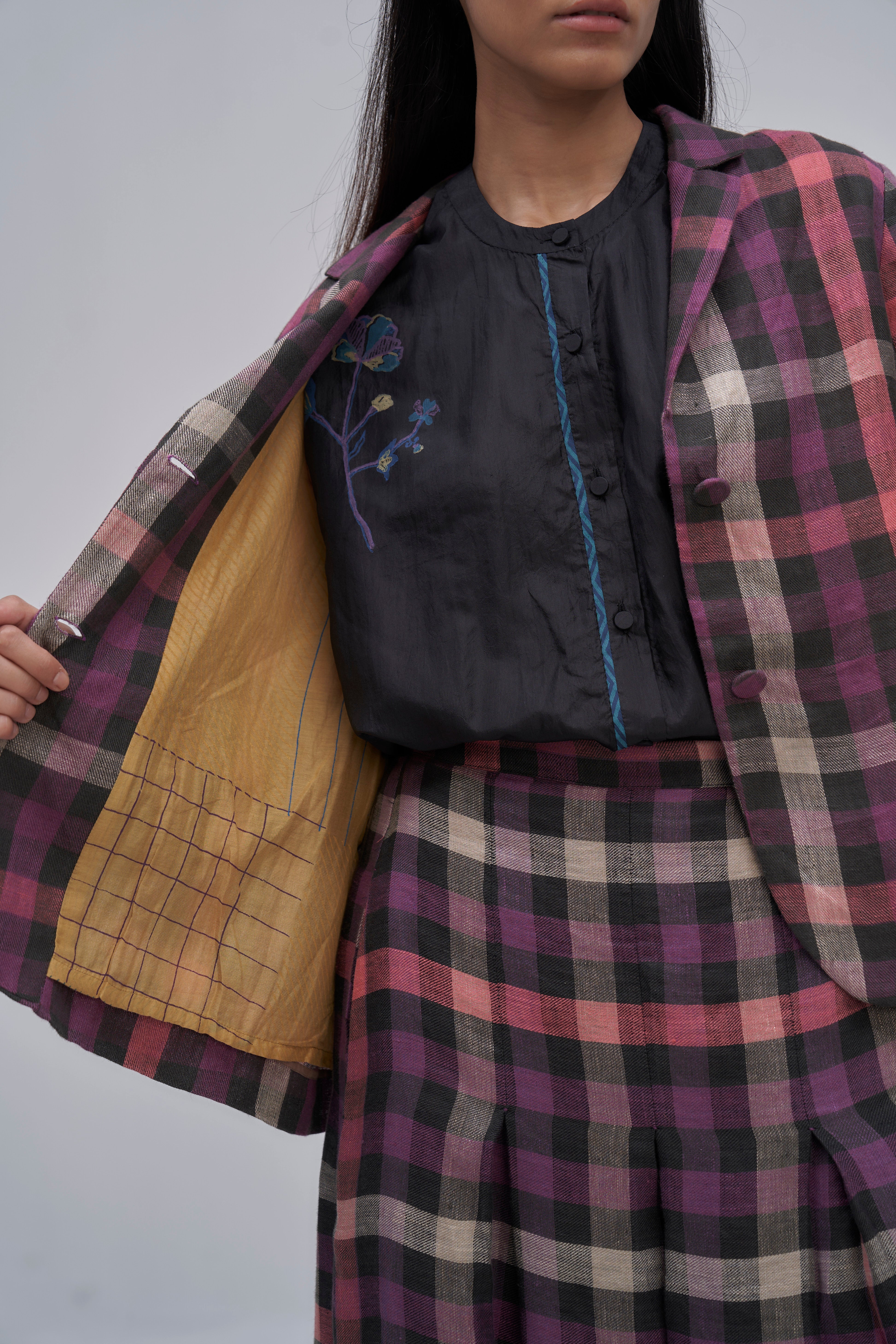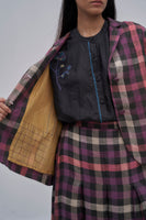 Notch collar straight fit front open short jacket with basic full sleeves and curved placket detail. Constructed in multicolor checkered 100% linen twill fabric. Finished with attached contrast collage handblock print lining detail.