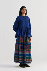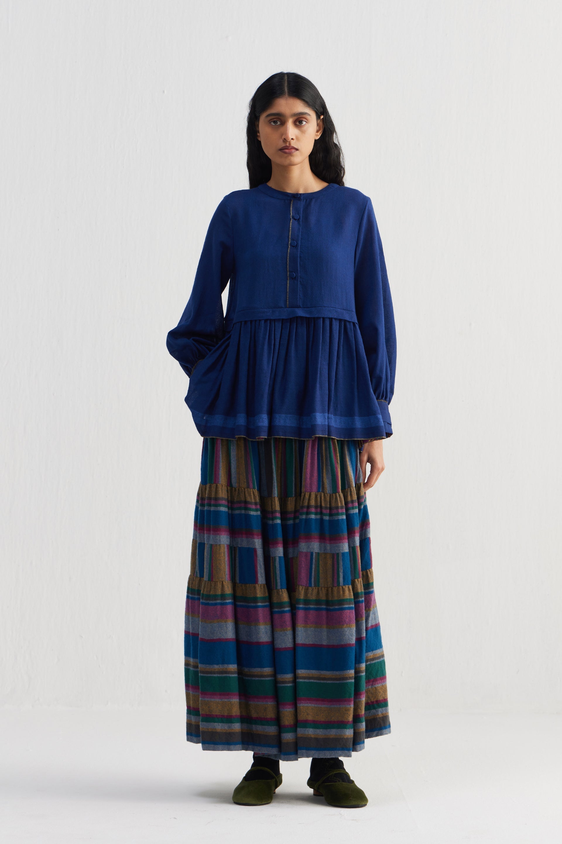Round neckline front placket relaxed fit full sleeves top with light puff and gathers at waist detail. Constructed in solid 100% merino wool fabric with selvedge on placket and on cuff. Finished with contrast handblock print 100% silk binding detail on cuffs, hem and facing detail.