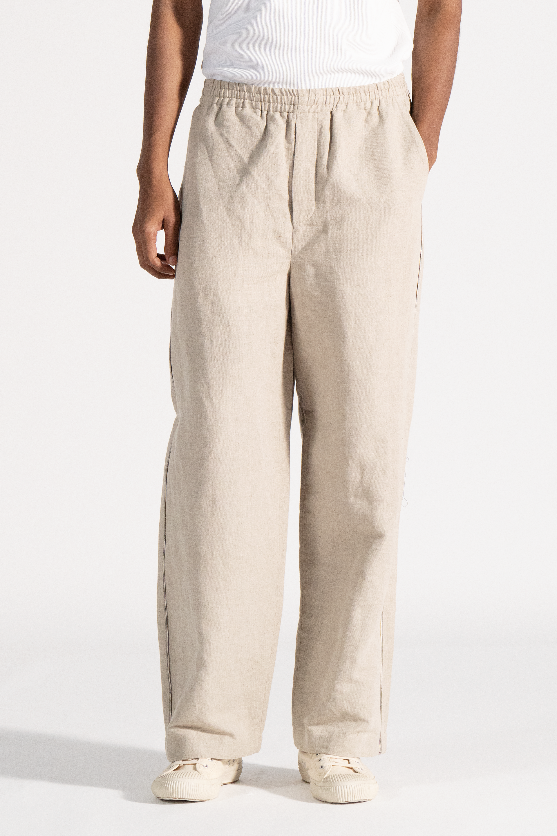 Baggy fit front pleat trouser with side pockets. Constructed in cotton linen fabric.