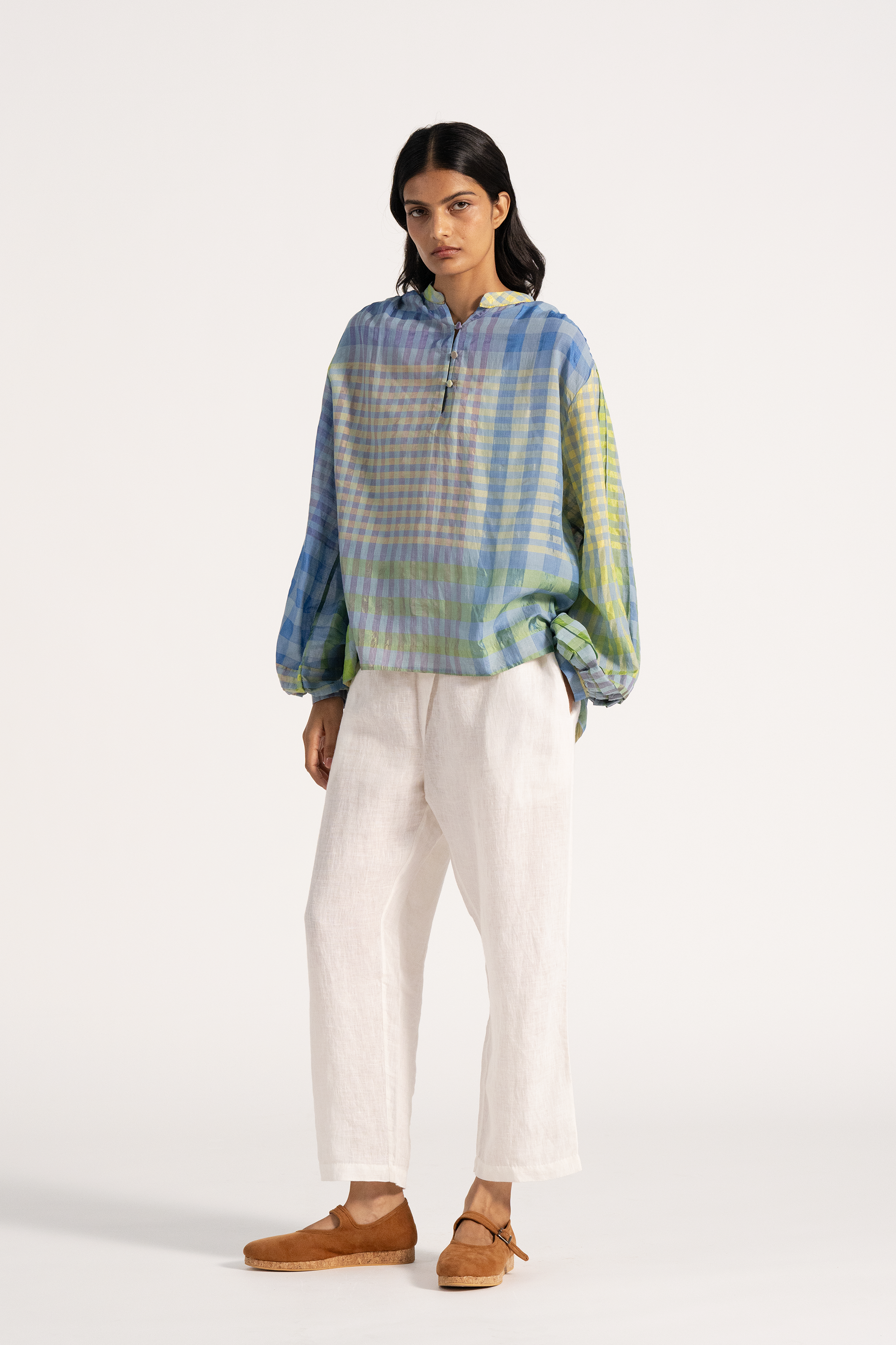 Multicolor checkered puff sleeved top in cotton silk blend.