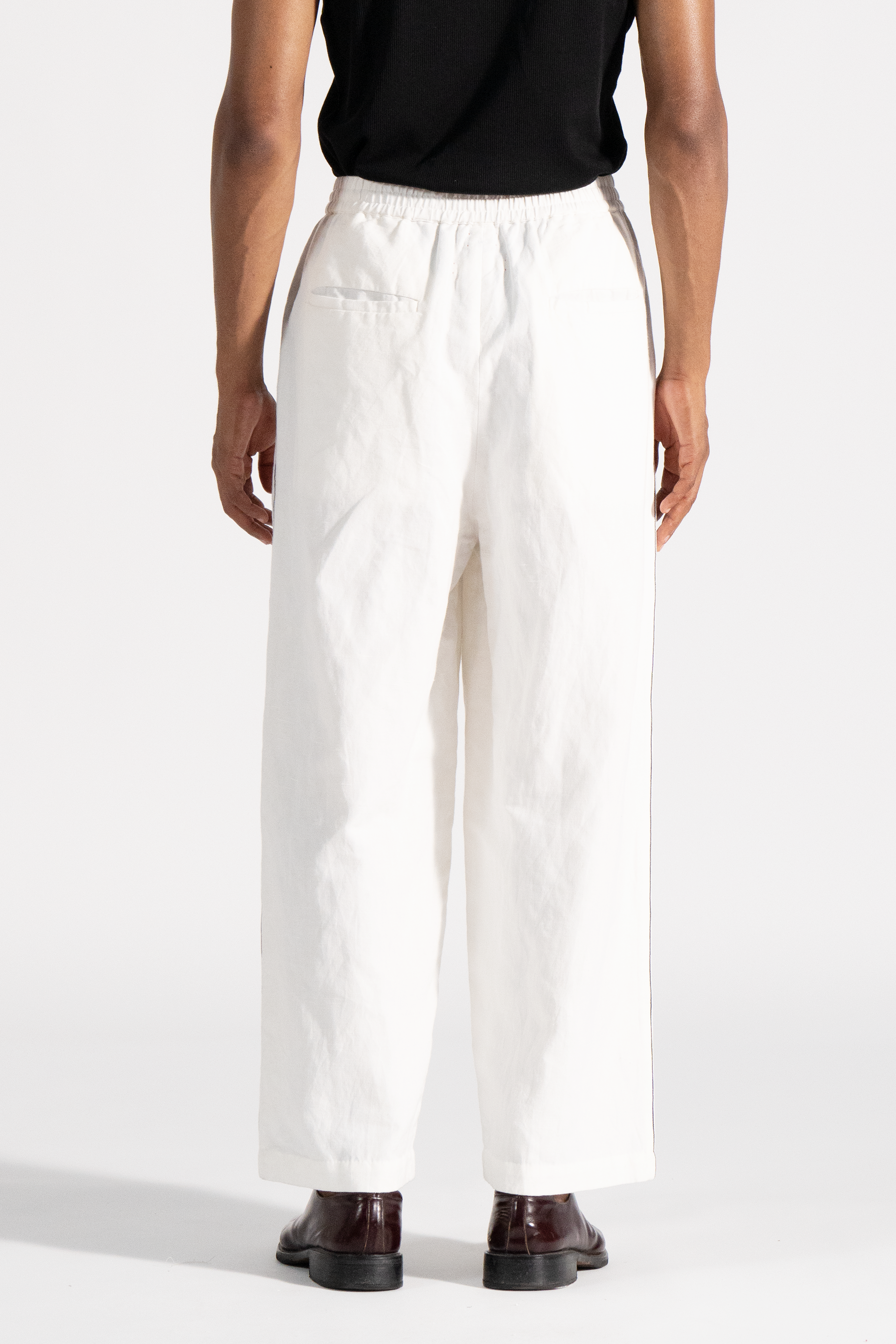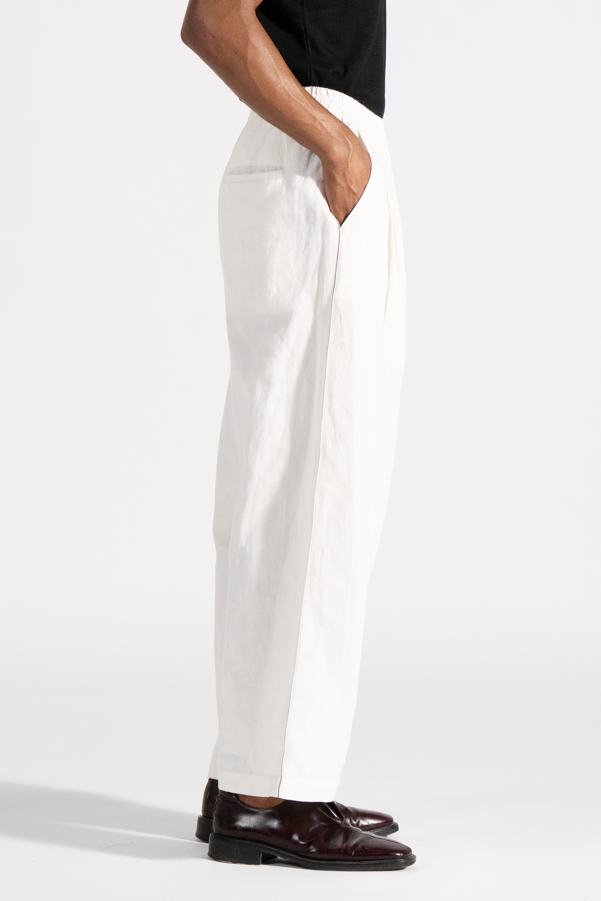Flare trouser with front pleat and contrast selvedge detail on the side seam in cotton linen fabric.