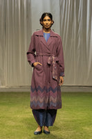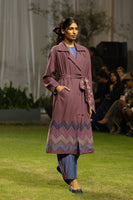 Wool tie-up dress with quilting and contrasting piping details, layered with jacquard checks wool.