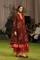 An adjustable-waist silk dress with minimal embroidery, featuring an additional ruffled skirt lining and layered with a multicolor Chamba embroidery jacket.