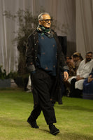 Textured jacquard shirt layered under a jacquard wool long jacket paired with wool pants and printed wool scarf.