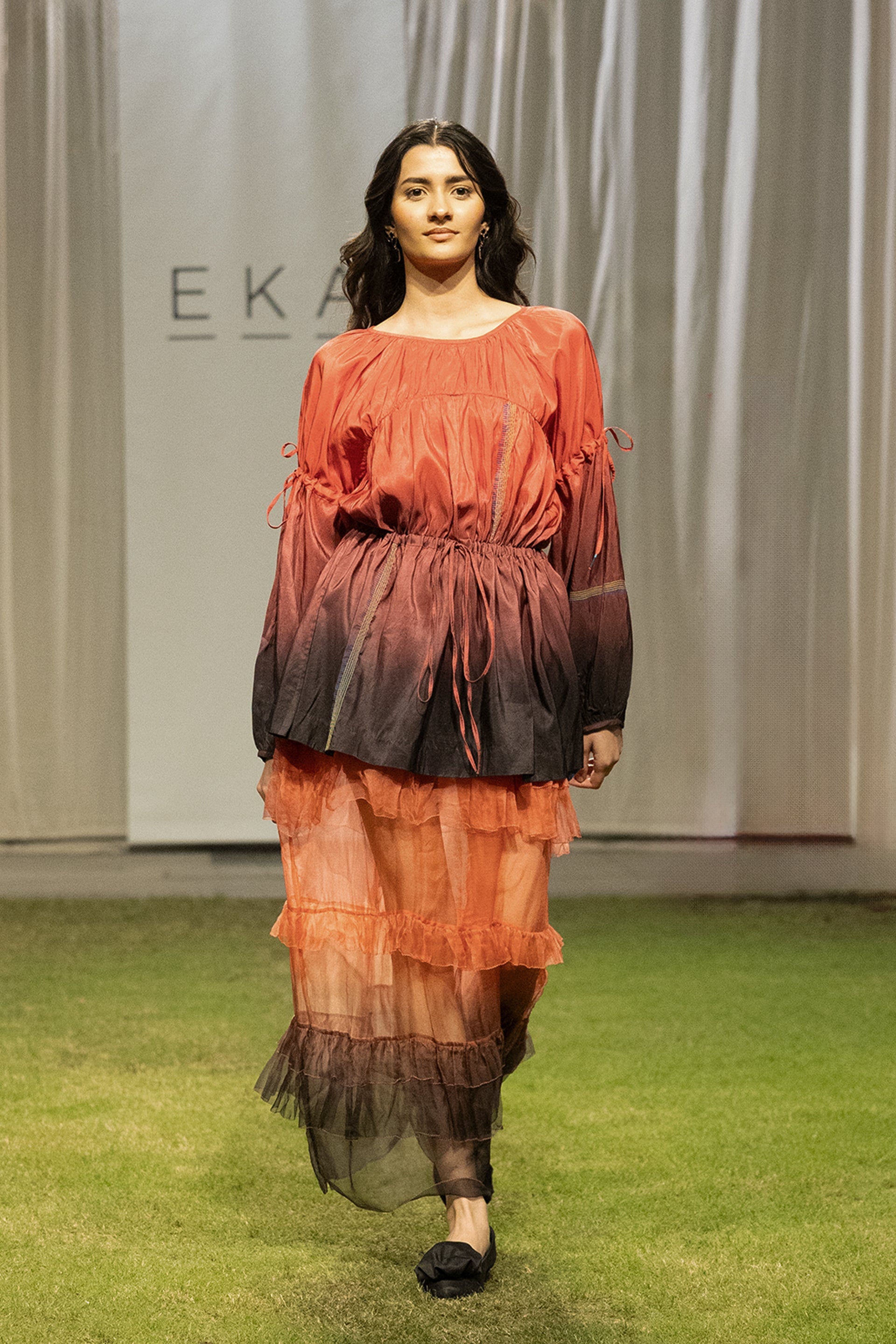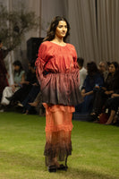 A flowing ombré taffeta top featuring adjustable sleeves and waist, styled with a matching ombré ruffled skirt.