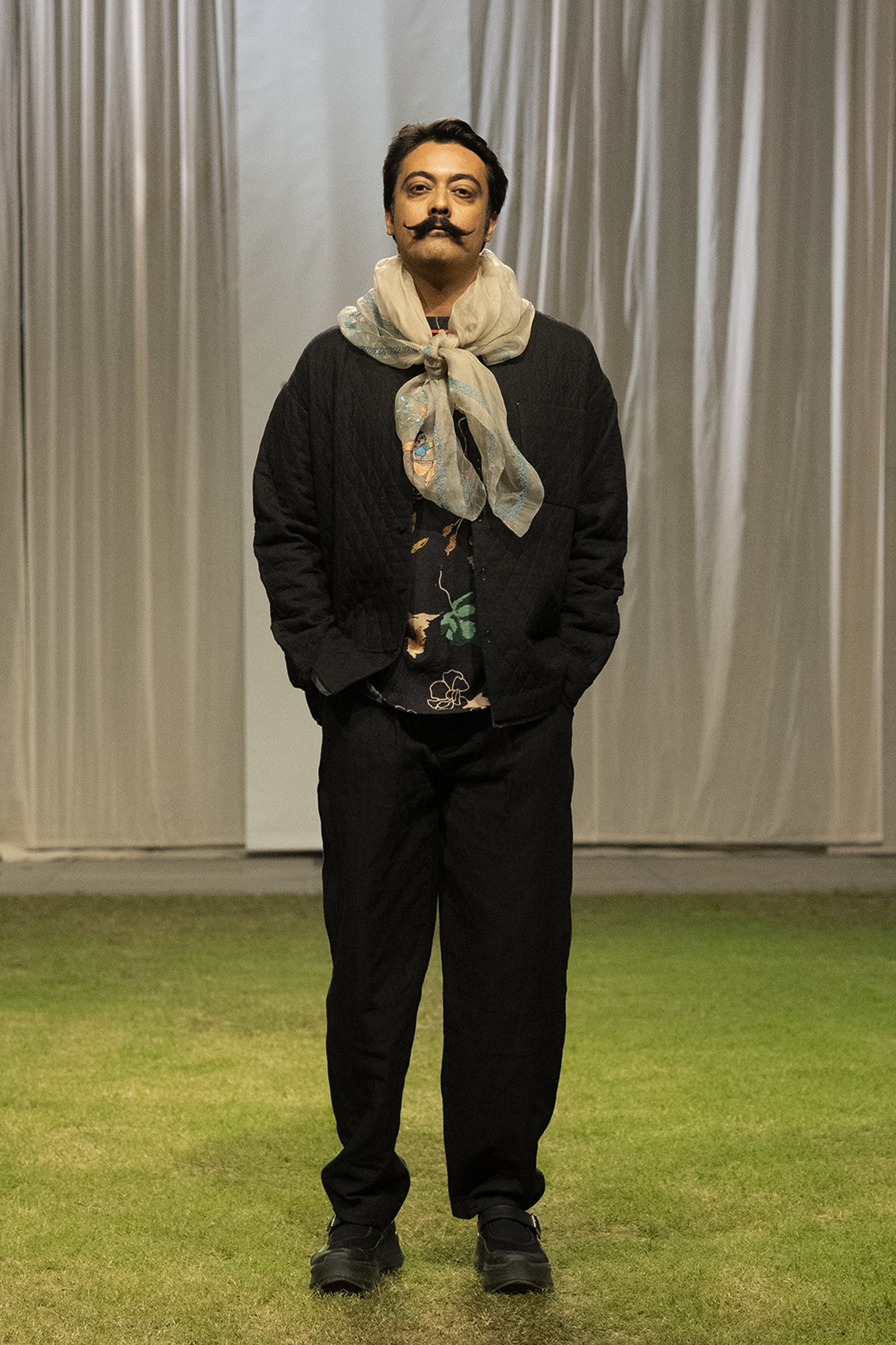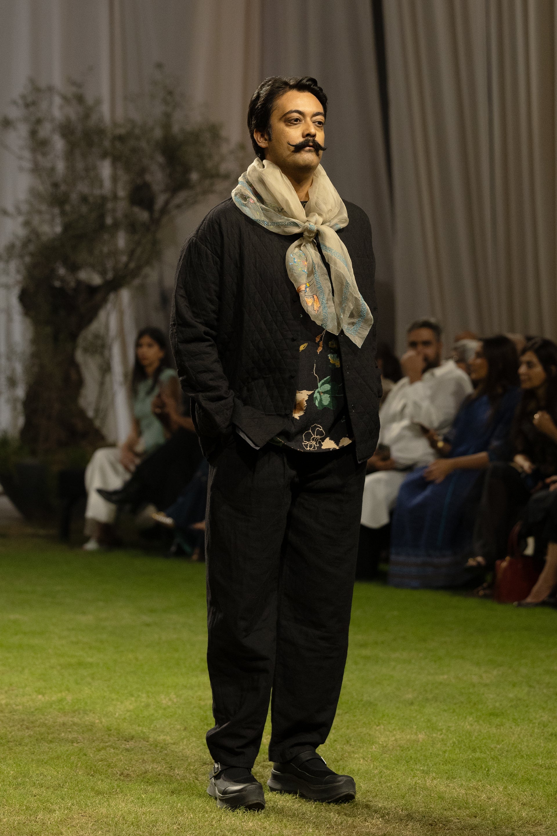 A printed wool shirt layered with a quilted jack et and paired with woolen pants, completed with a hand-embroidered Chamba scarf.