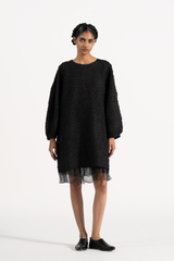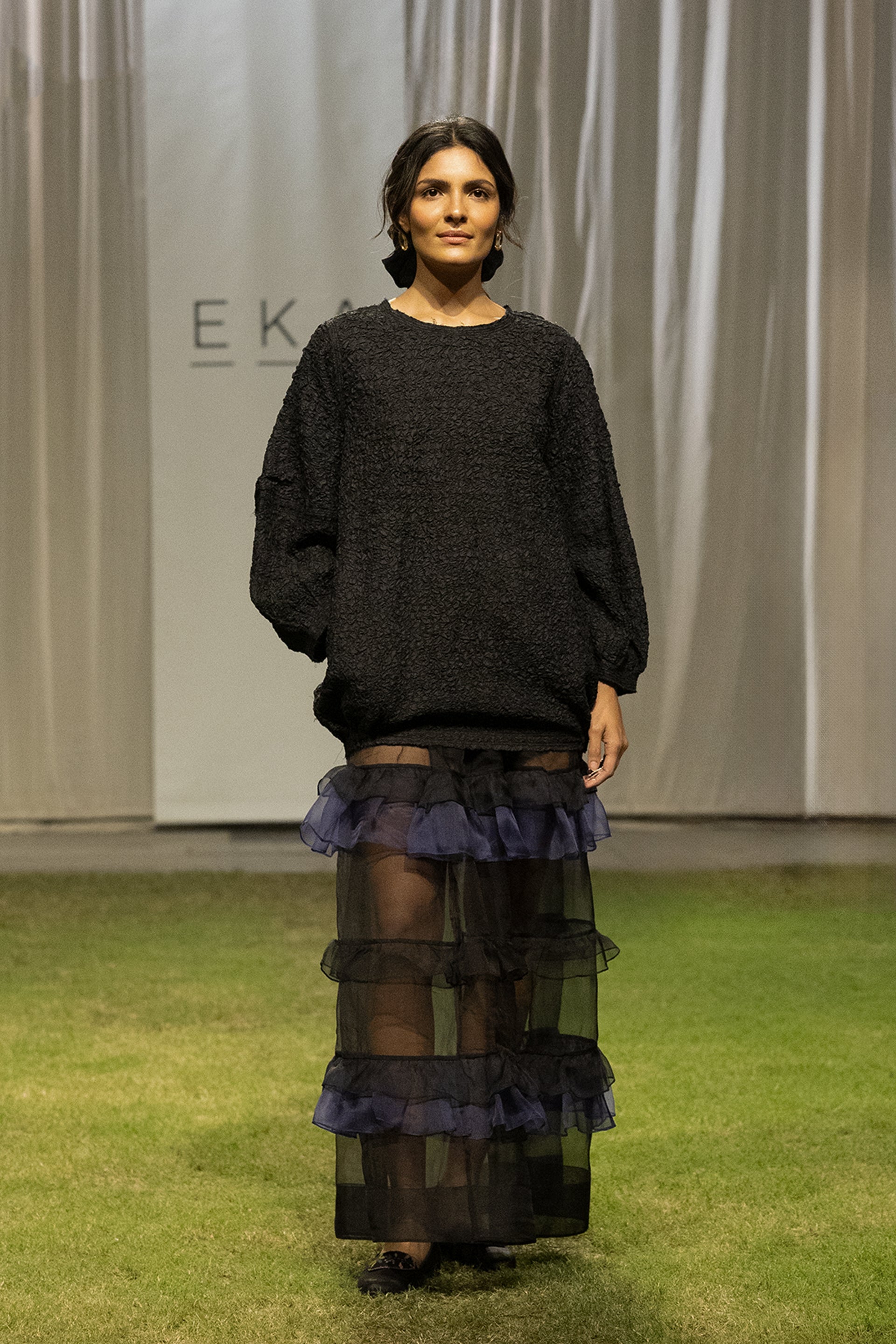Smocked overall top with organza ruffle skirt and contrast detailing.
