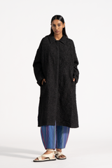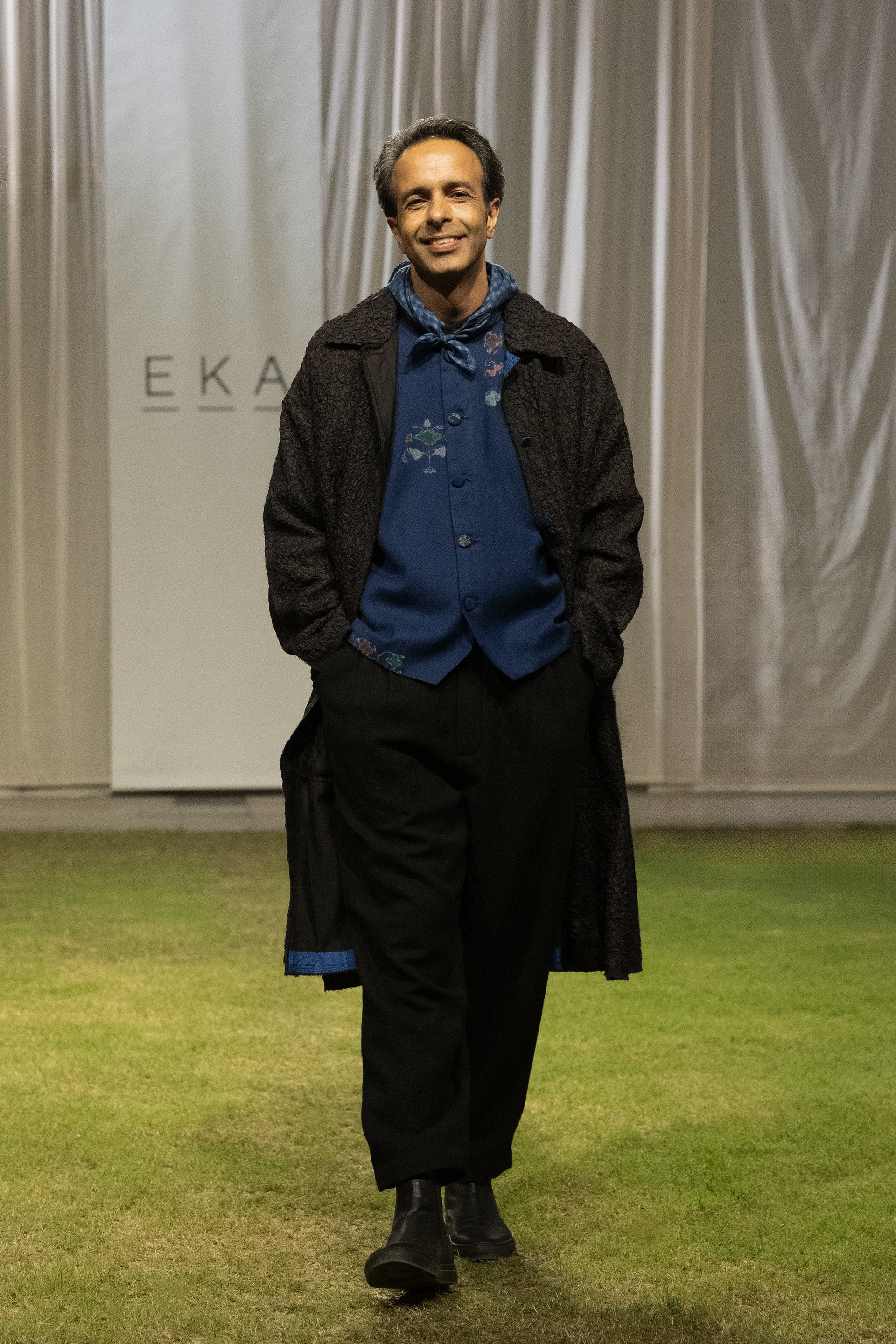 A textured jacquard waistcoat layered under a smocked long with contrasting details, styled with wool pants.