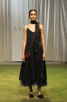 Strappy quilted dress with placement embroidery, featuring an organza ruffle skirt lining and styled with an all-over embroidered scarf.