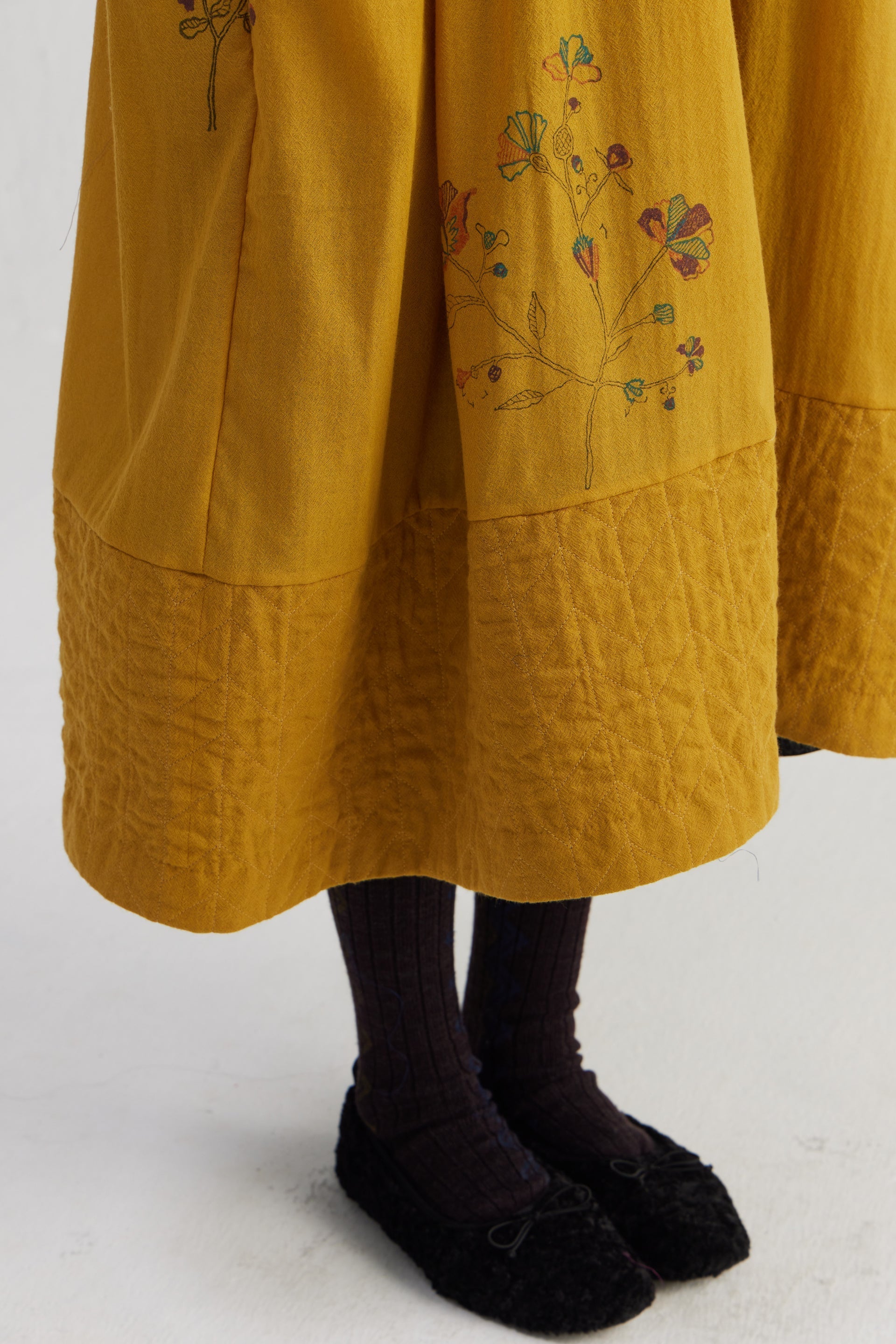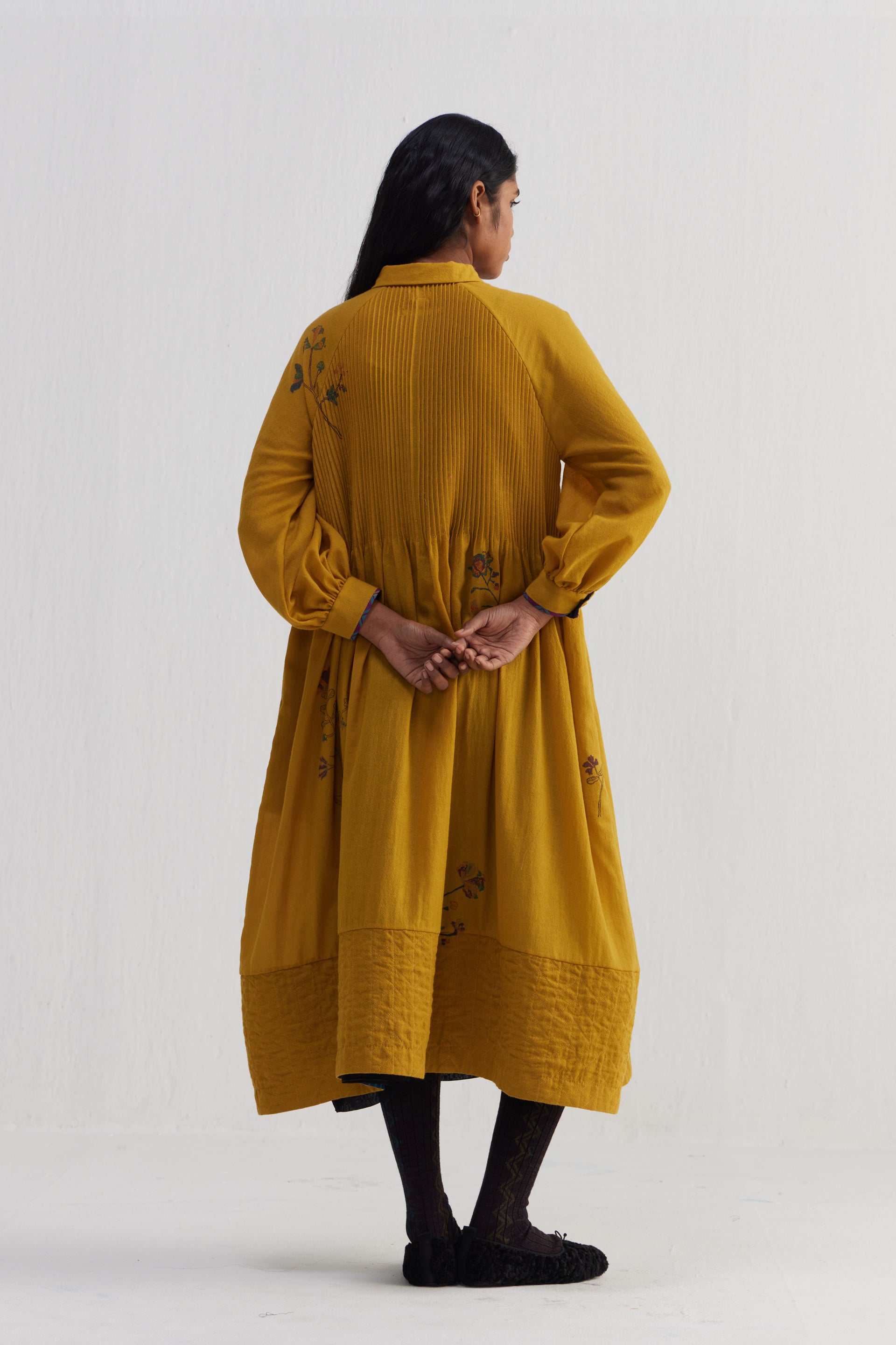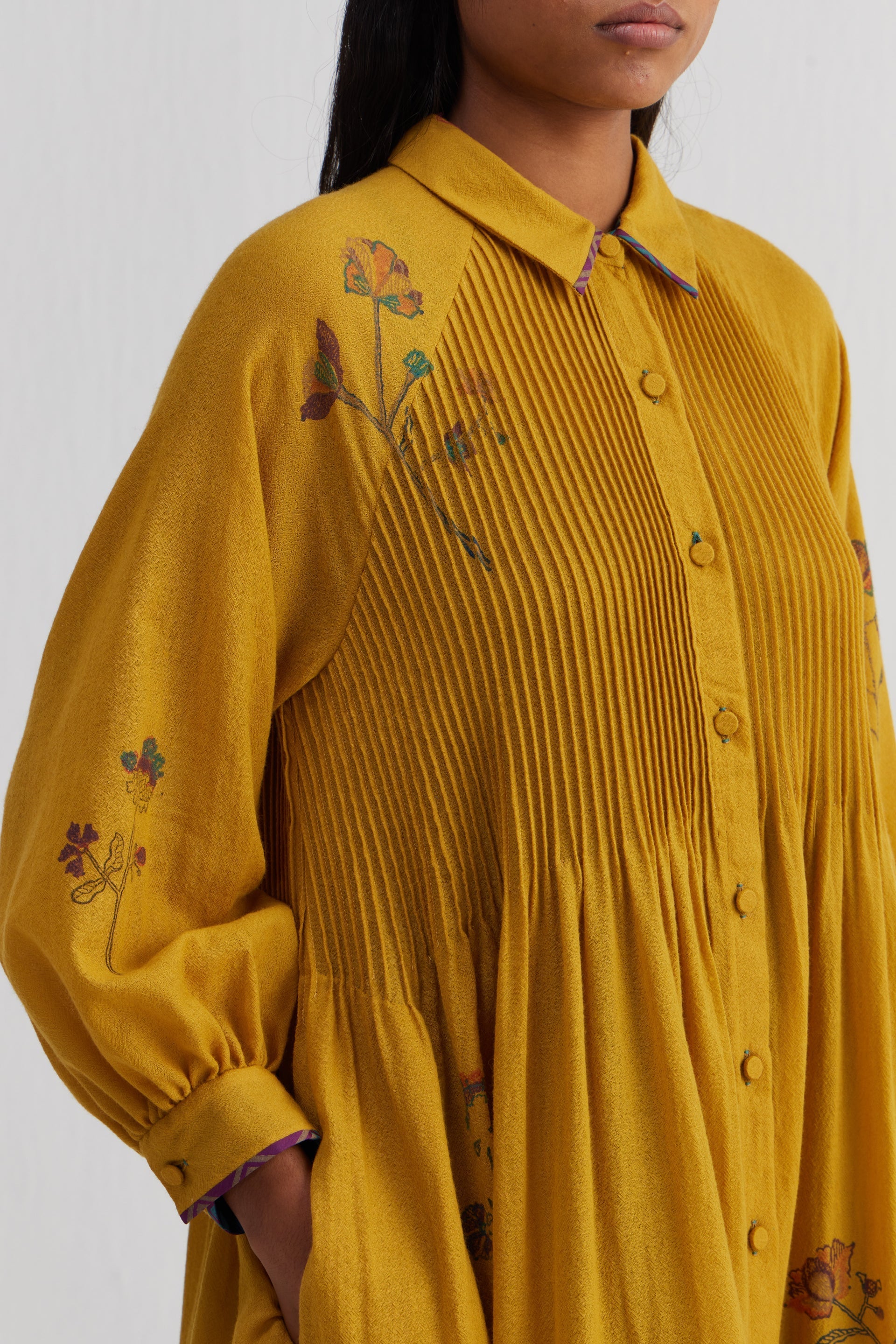 Relaxed fit front open button down collar midi dress with full puff raglan sleeves, pin tucks allover the bodice and quilting detail on hem. Constructed in solid 100% merino wool with placement handblock print. Finished with contrast handblock print 100% silk fabric piping and facing detail.