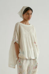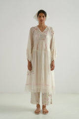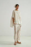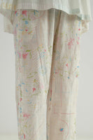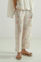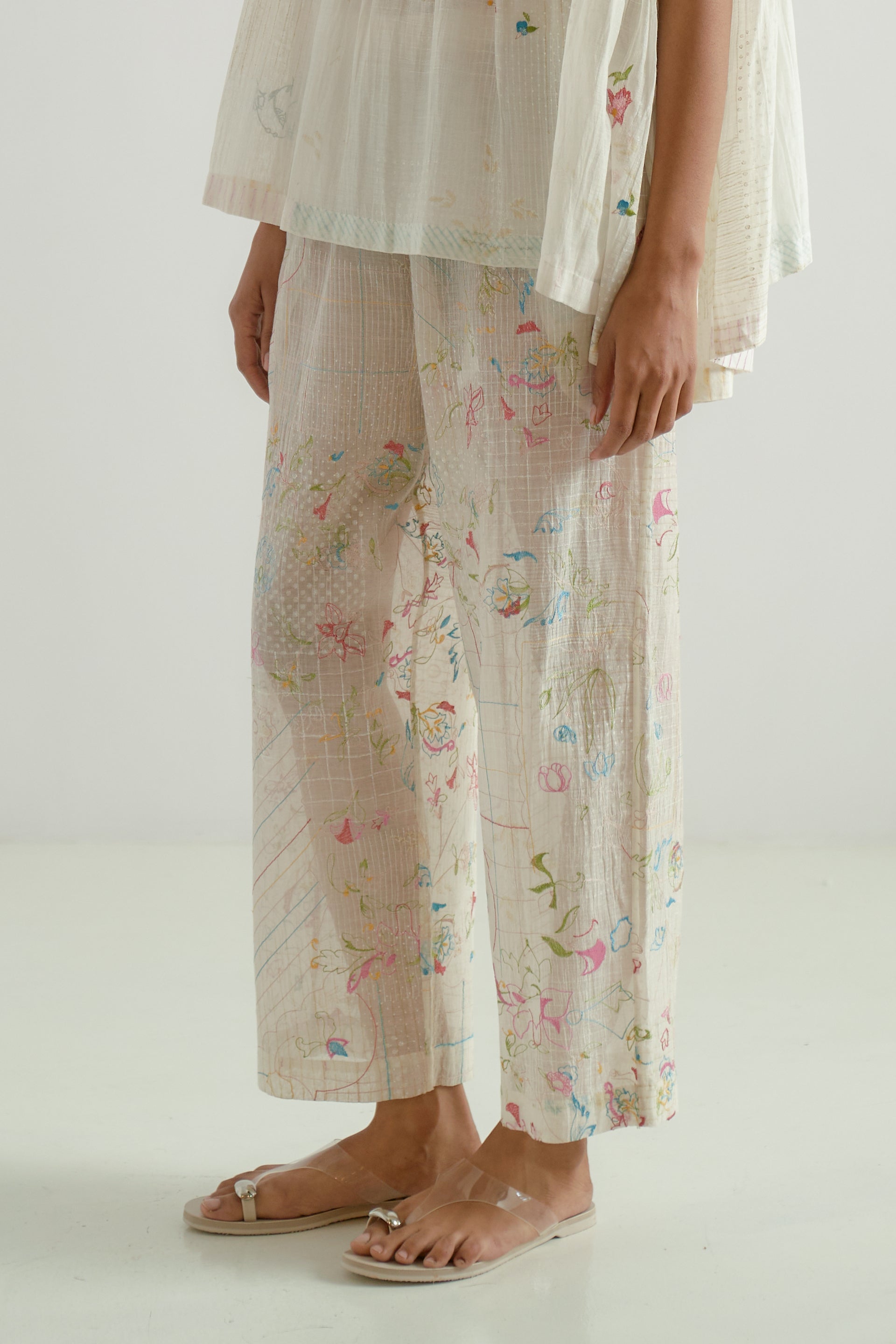 Mid-waist straight-fit ankle length trousers. Crafted from a 100% cotton-silk blend, the fabric showcases a tonal hand-block printed collage pattern, beautifully complemented by all-over multicolor floral embroidery.
