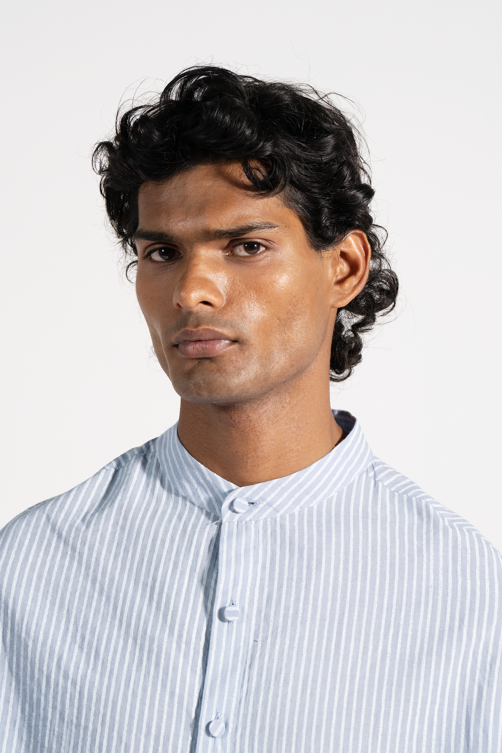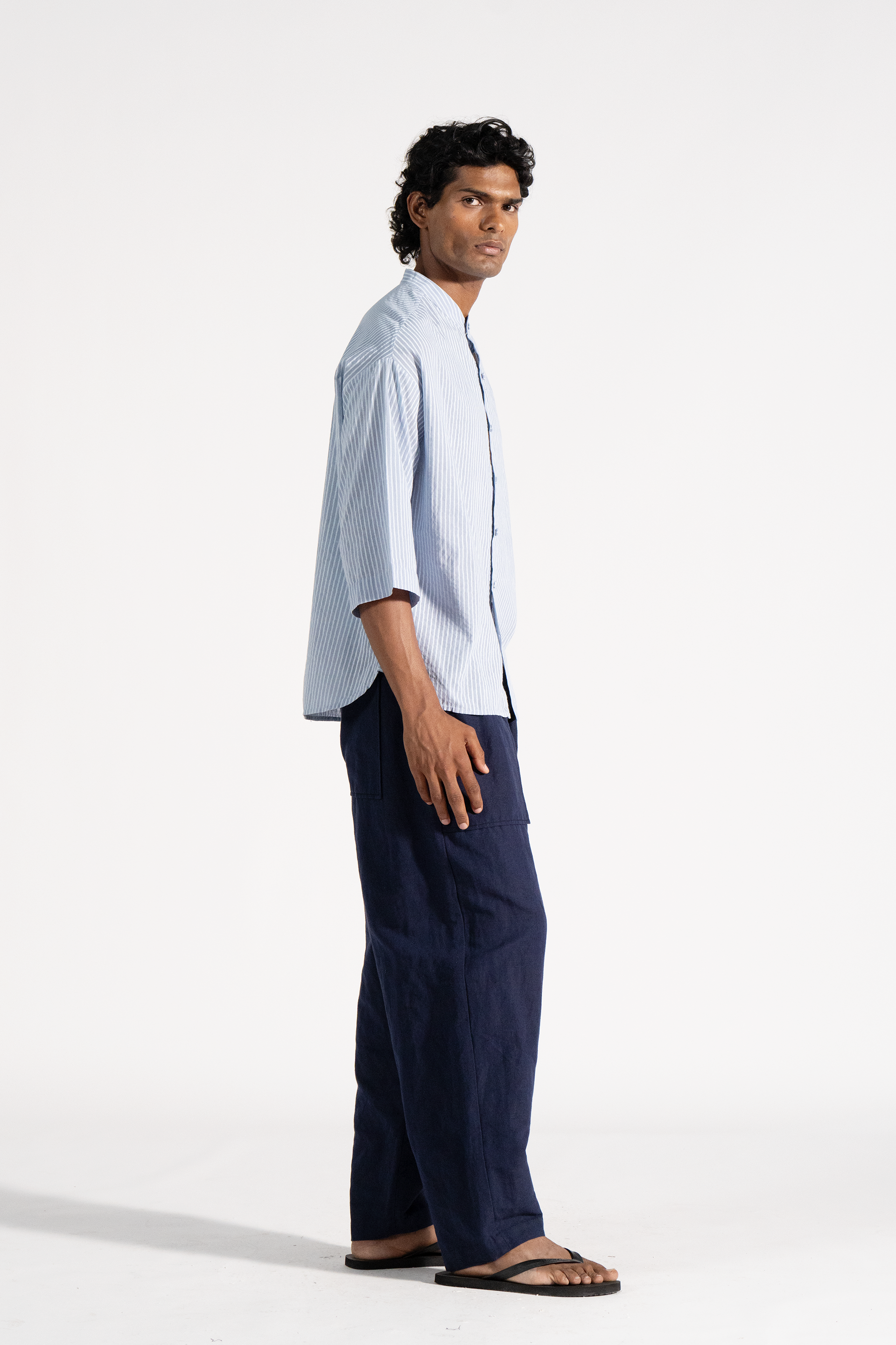 Mandarin collar relaxed fit shirt with 3/4 sleeve detail in khadi with handlock stripe print.