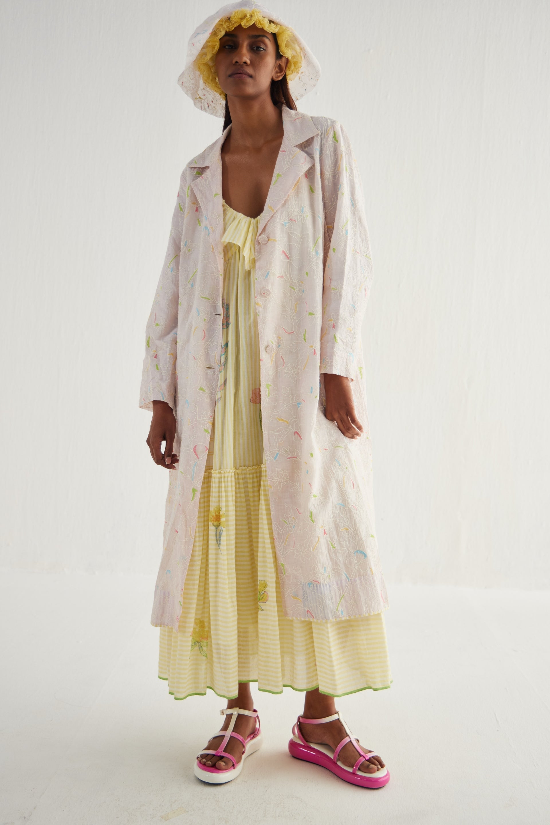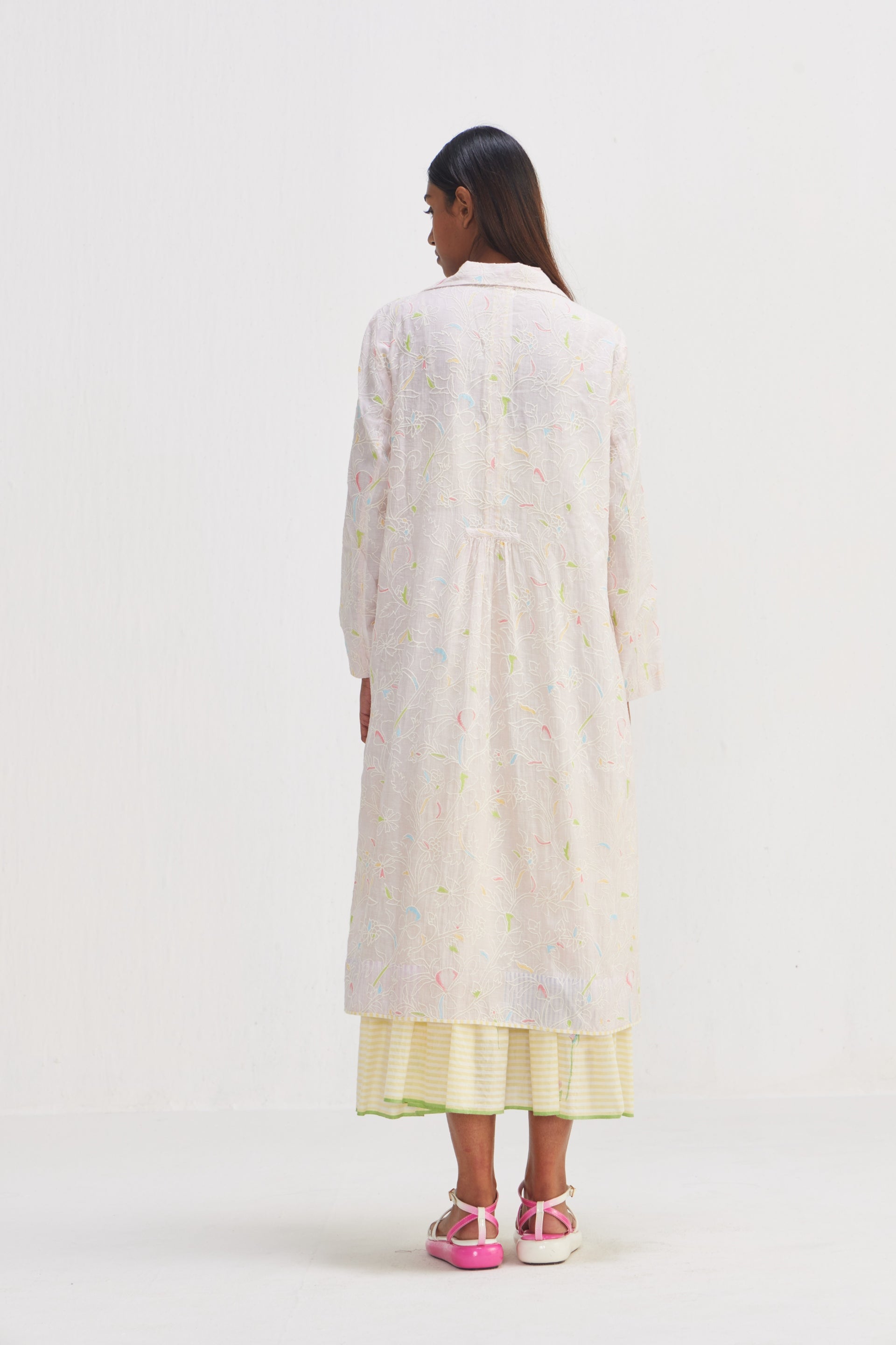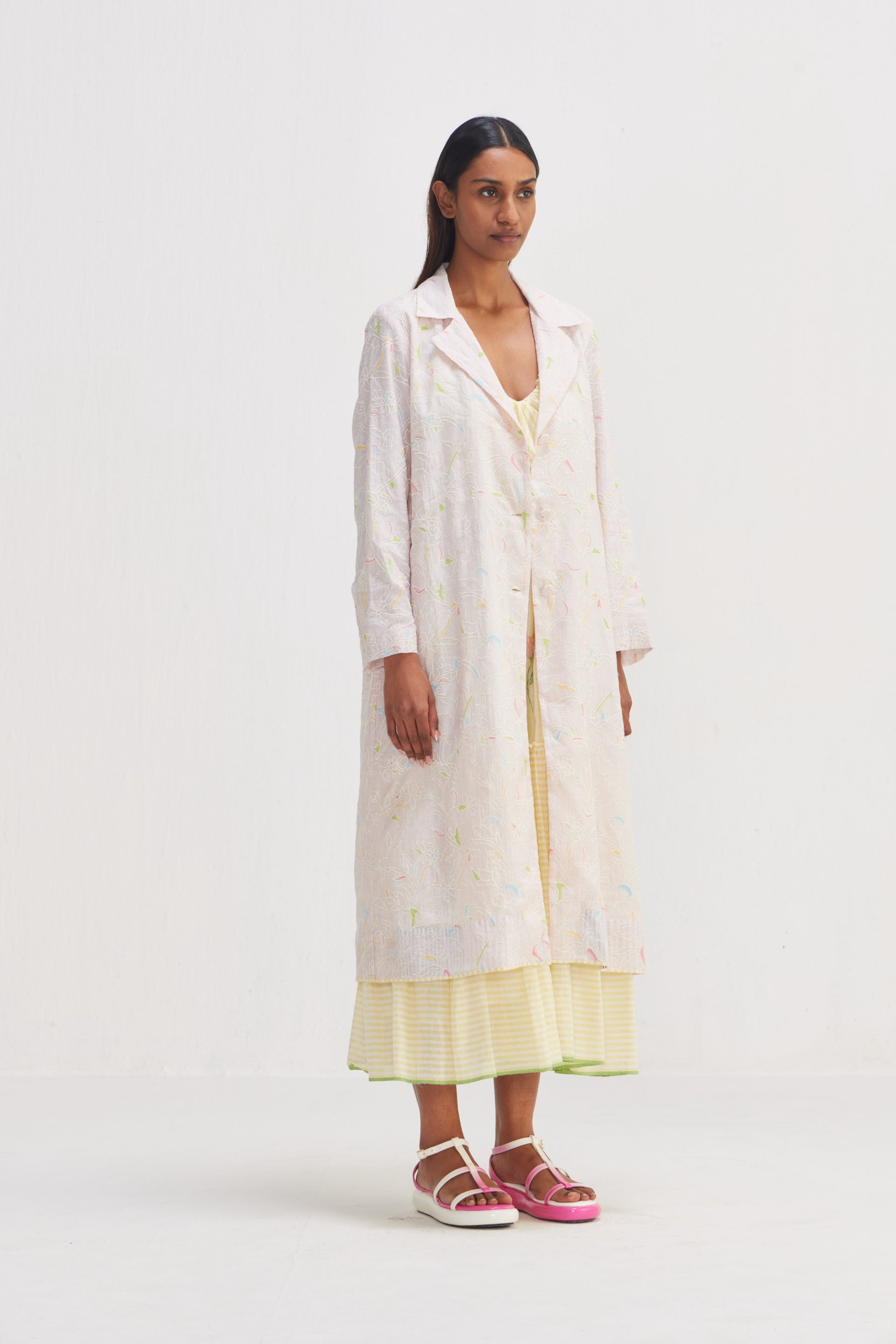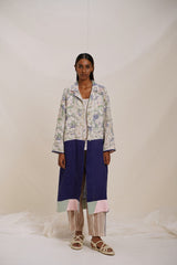 Long Button Down Jacket, crafted from floral embroidered fabric. Featuring a notch collar and contrast piping detail on the hem, this jacket exudes sophistication with a touch of flair. Complete with an attached text printed lining.
