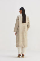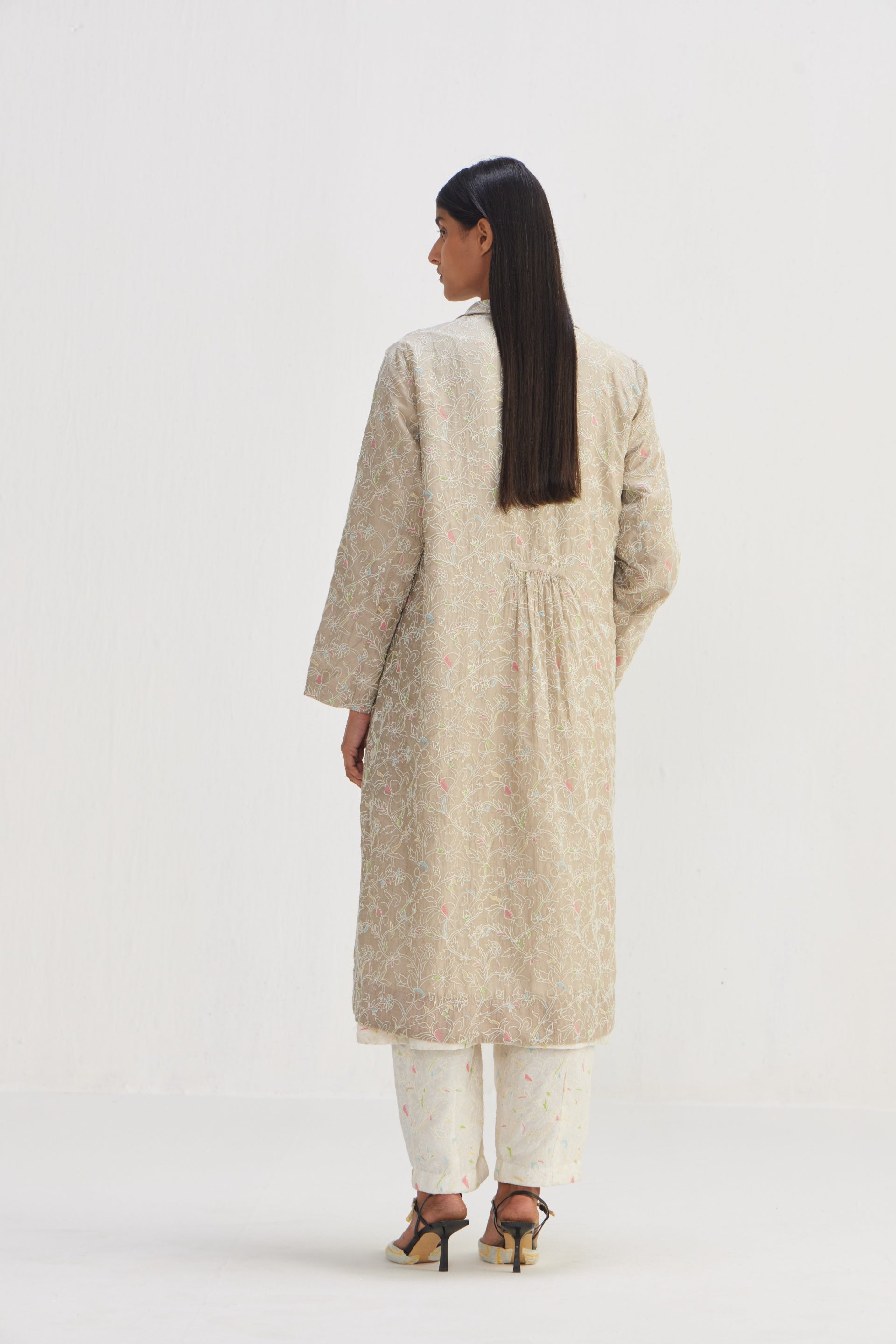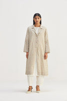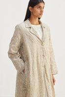 Long length jacket in fully floral embroidered design. Comes with an attached text printed lining.