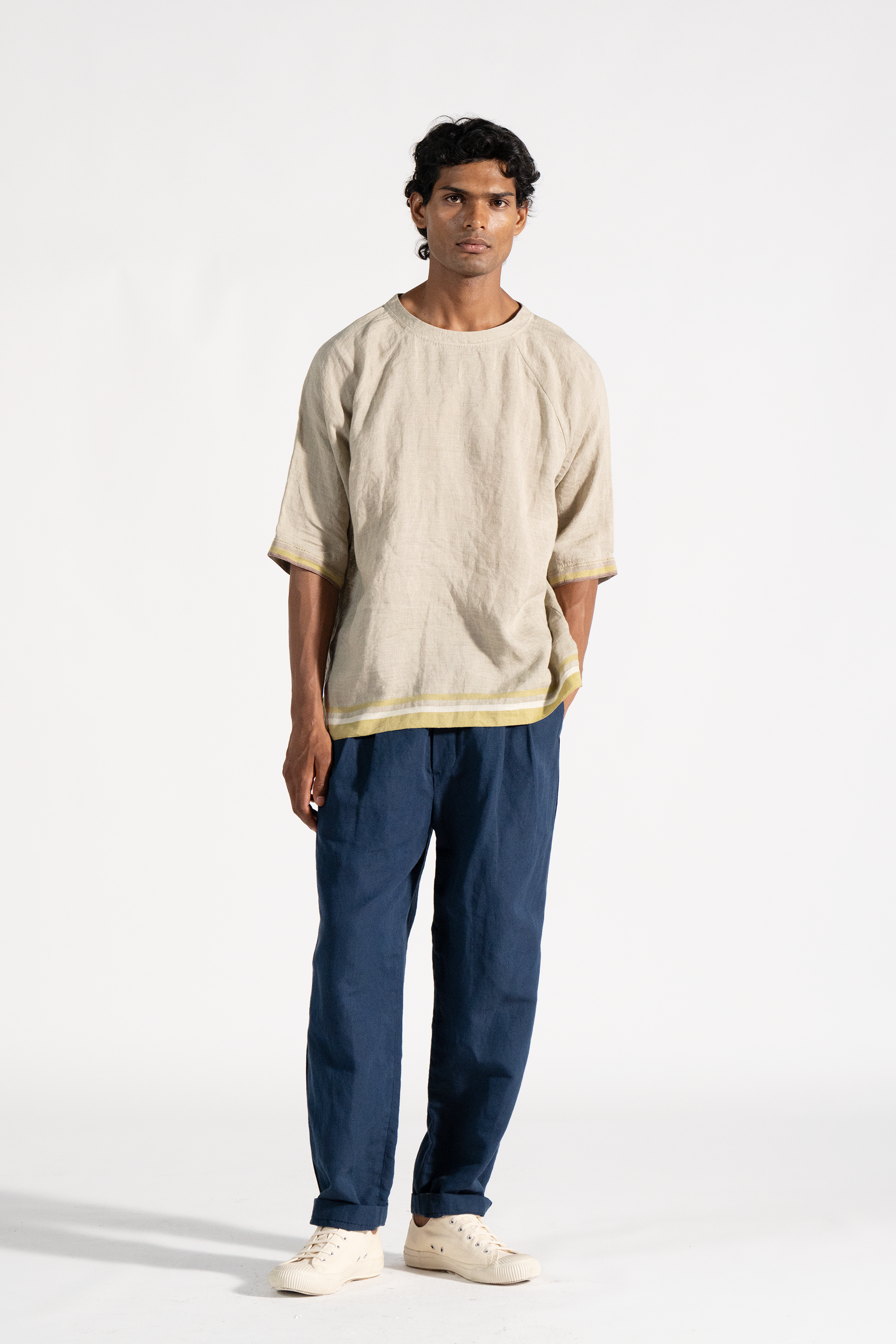 Crew neck relaxed fit with raglan sleeve linen t-shirt in dual tone.