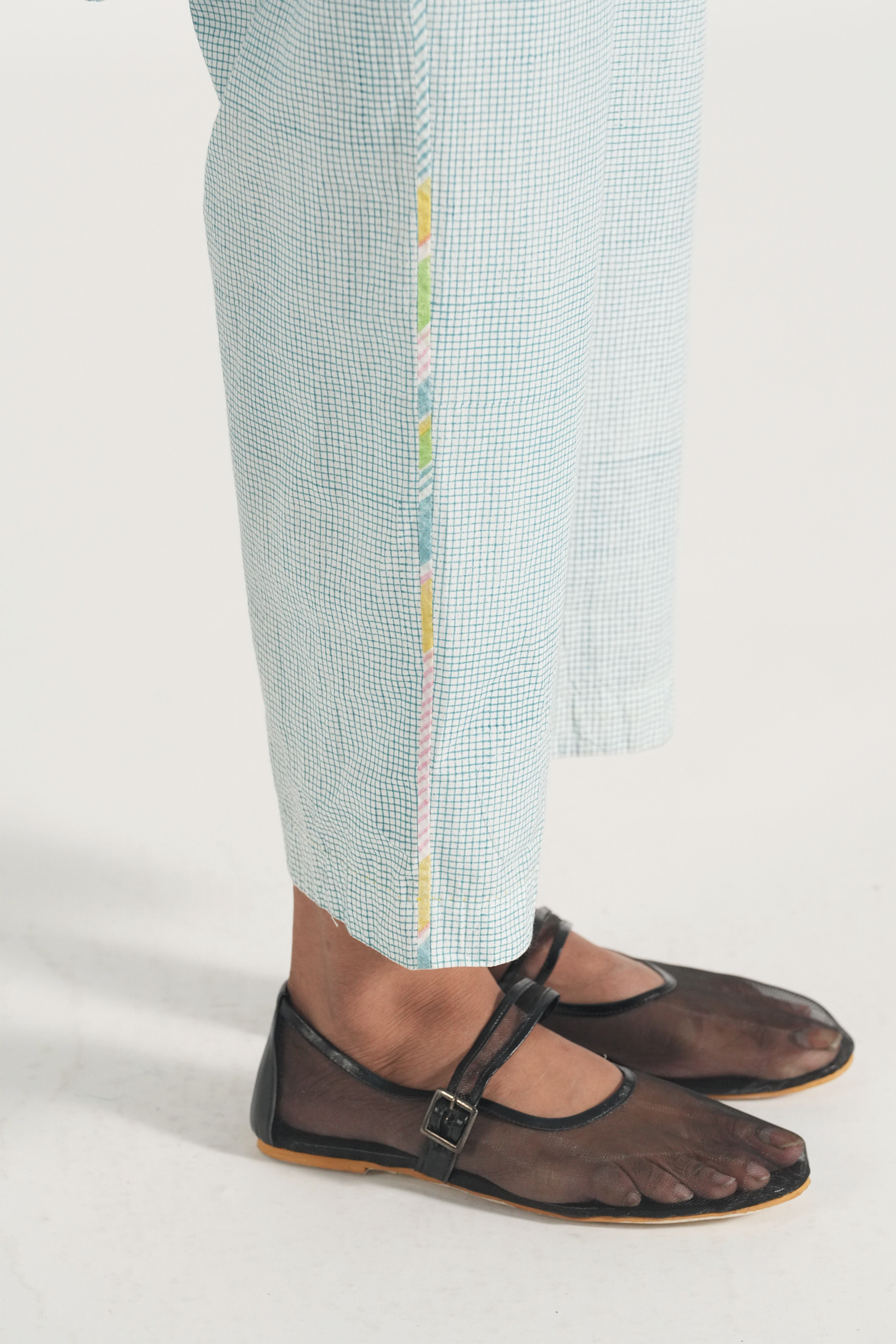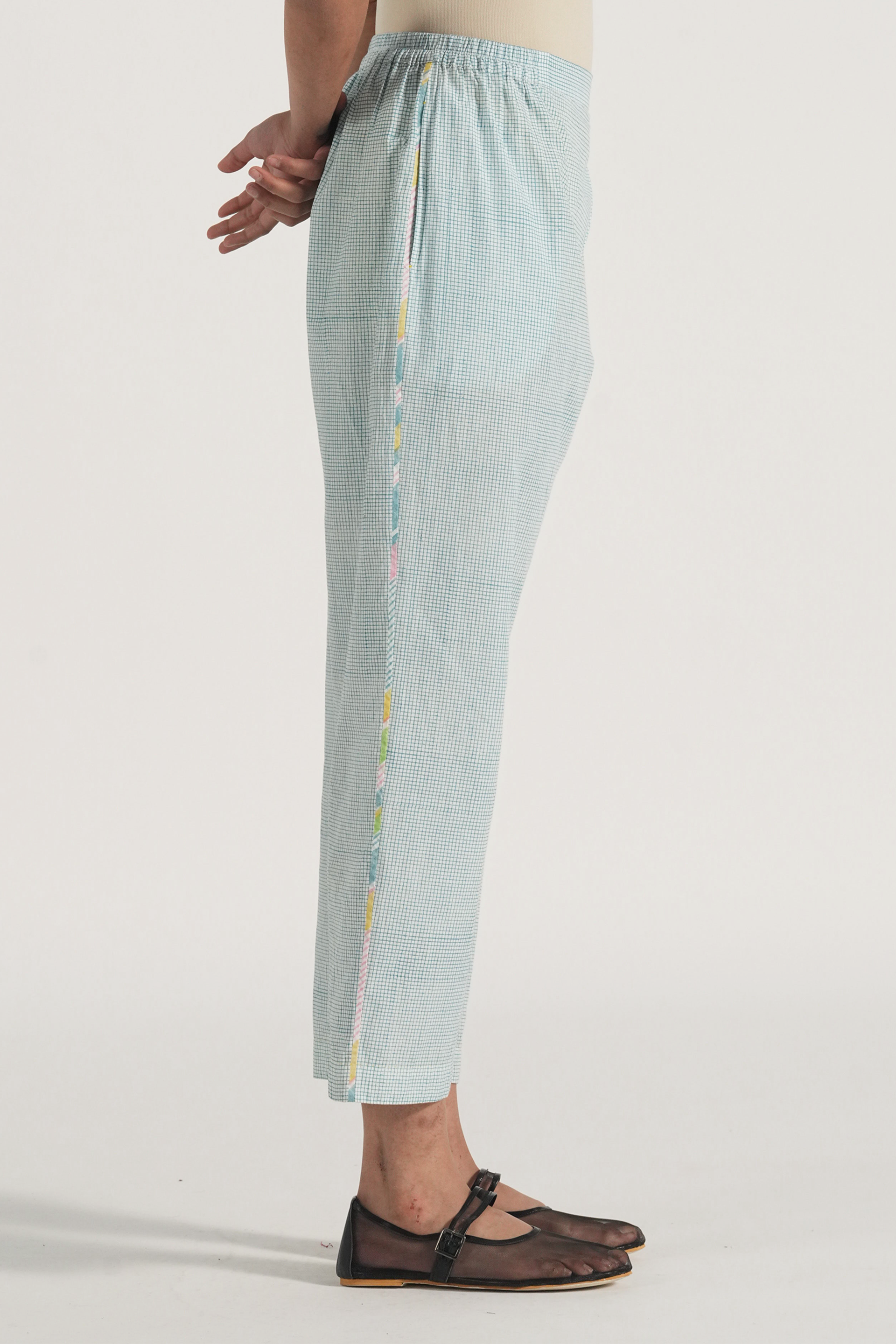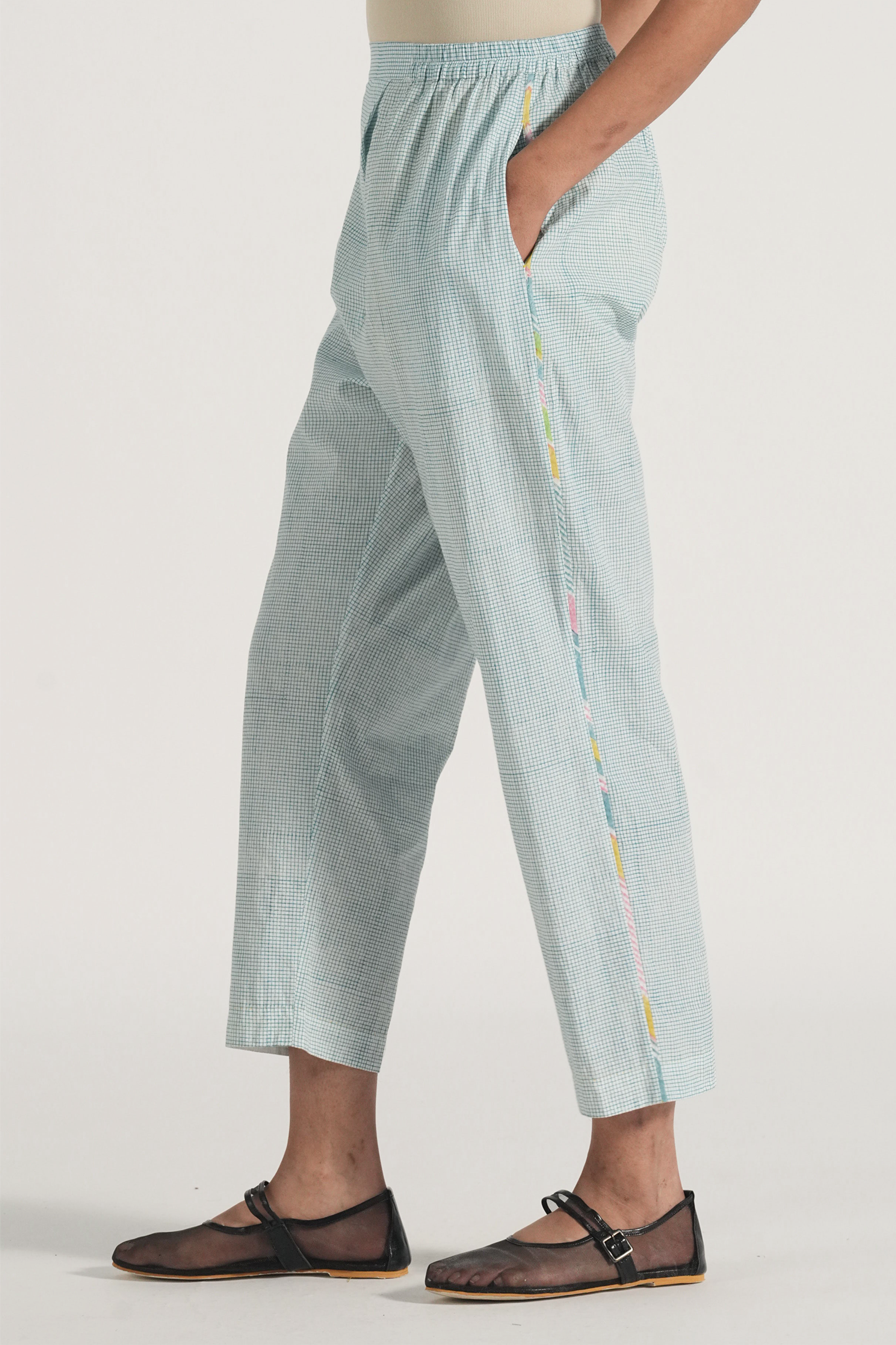 Straight fit pants in hand blocked checks print accentuated with multicolor block print binding on the side seams
