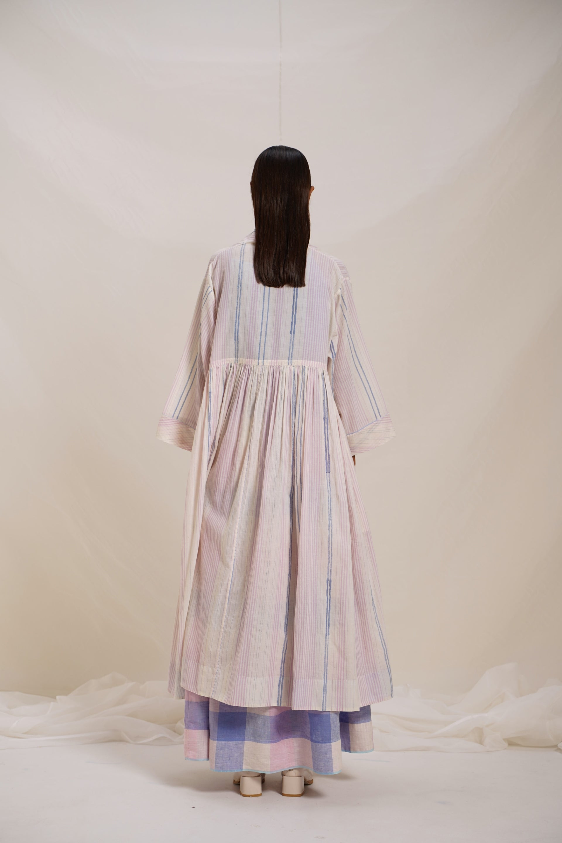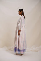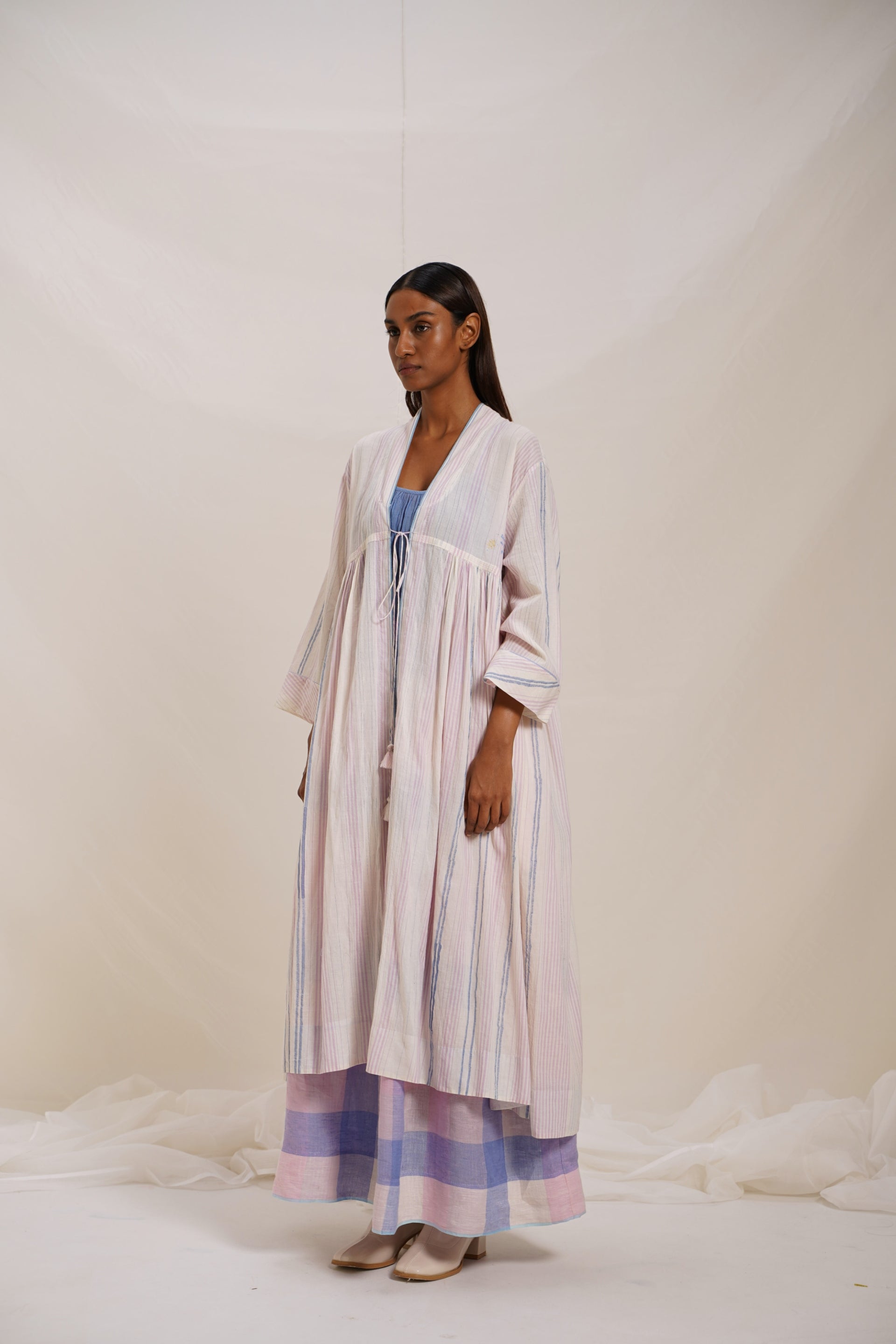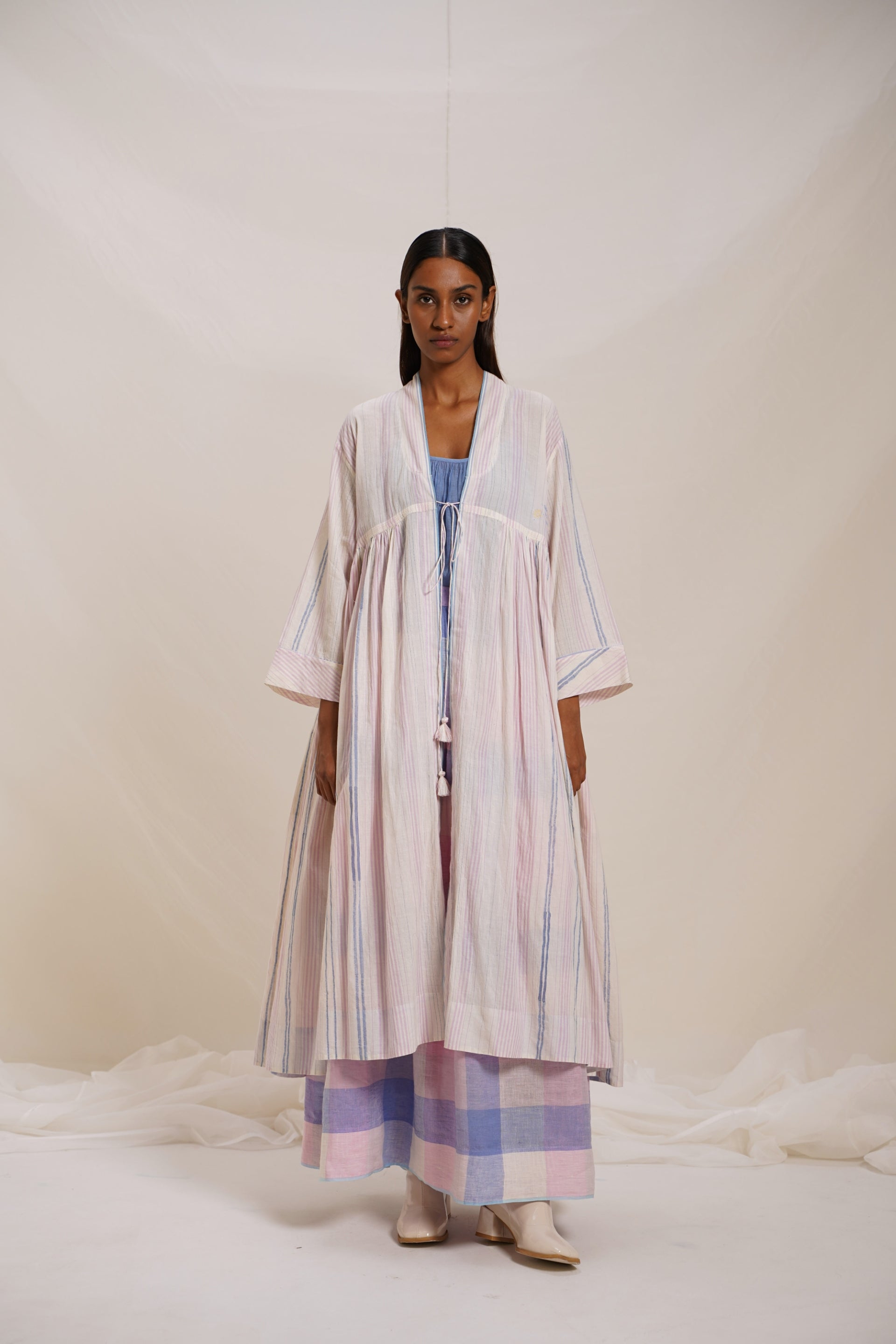 Long jacket, a statement piece featuring woven stripes, abstract lines print inserts, and intricate crochet trim detail, with hand embroidered text detail, adding a touch of sophistication to your look. This jacket seamlessly blends style and craftsmanship.