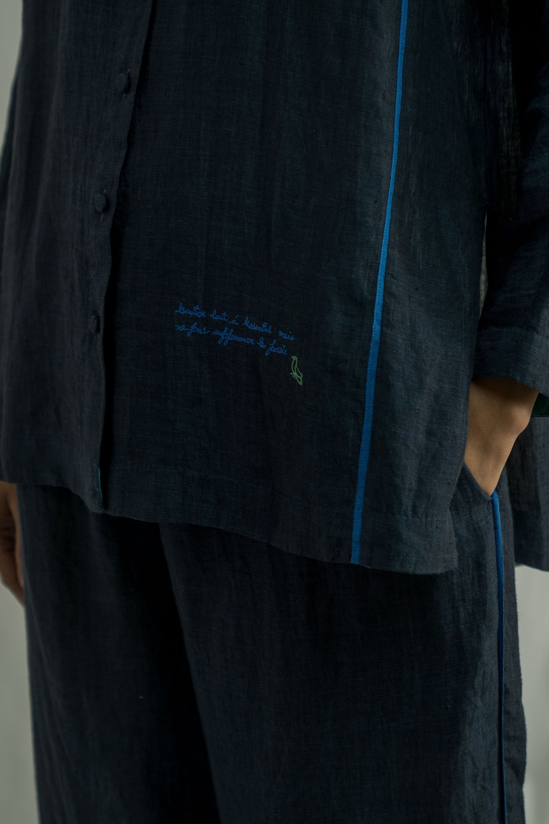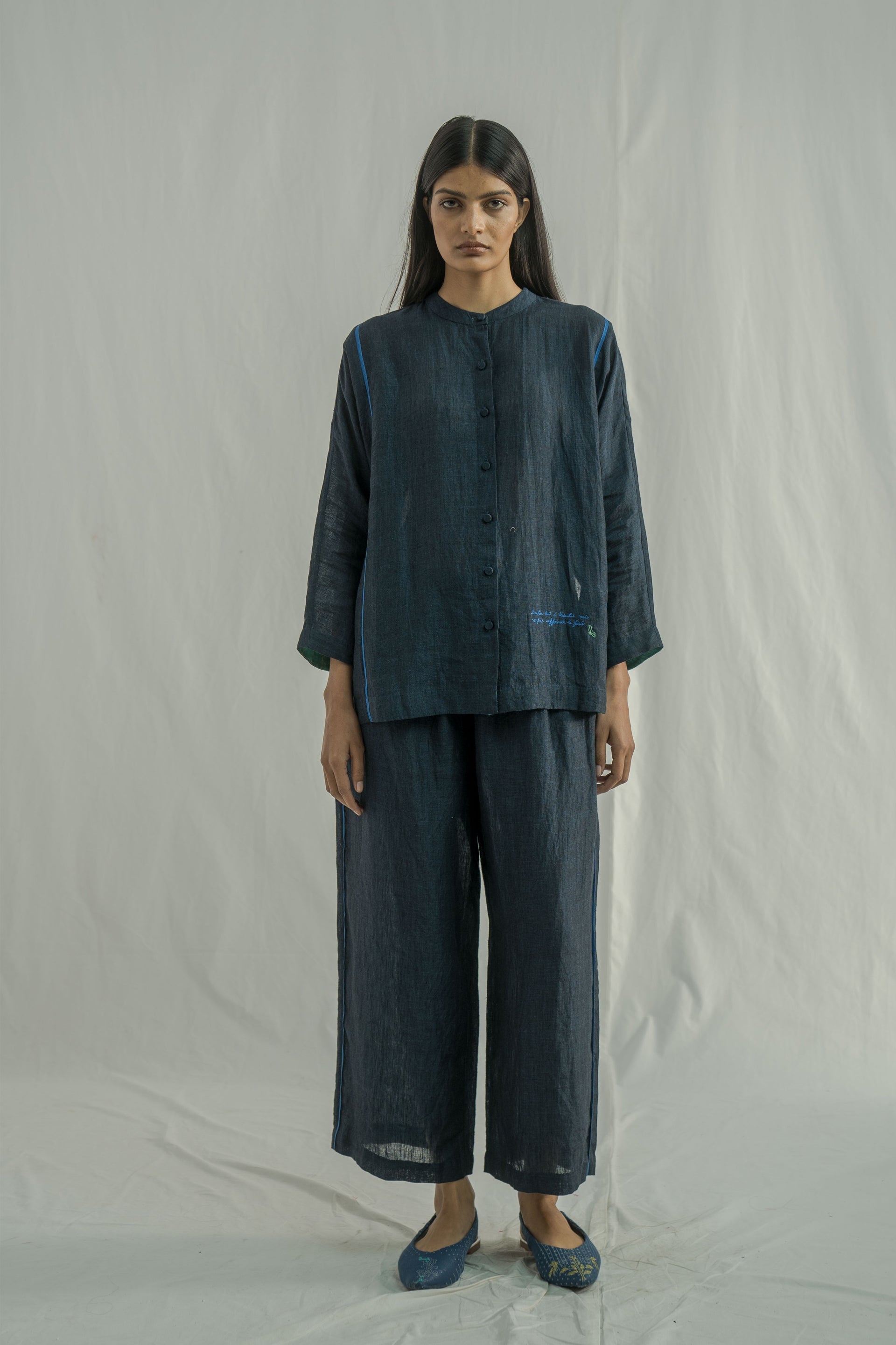 A stand collar, straight fit front open button down shirt with full sleeve. constructed in solid 100% linen fabric with contrast selvedge detail.