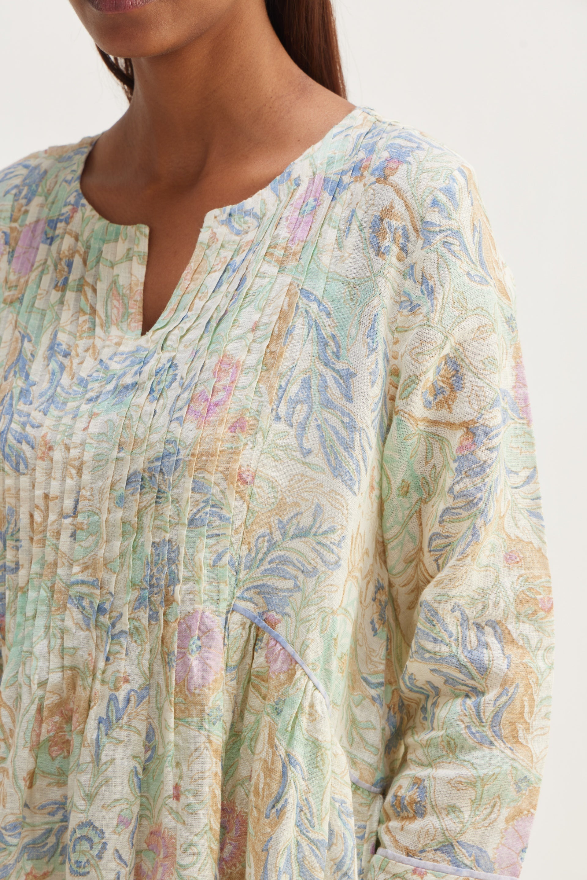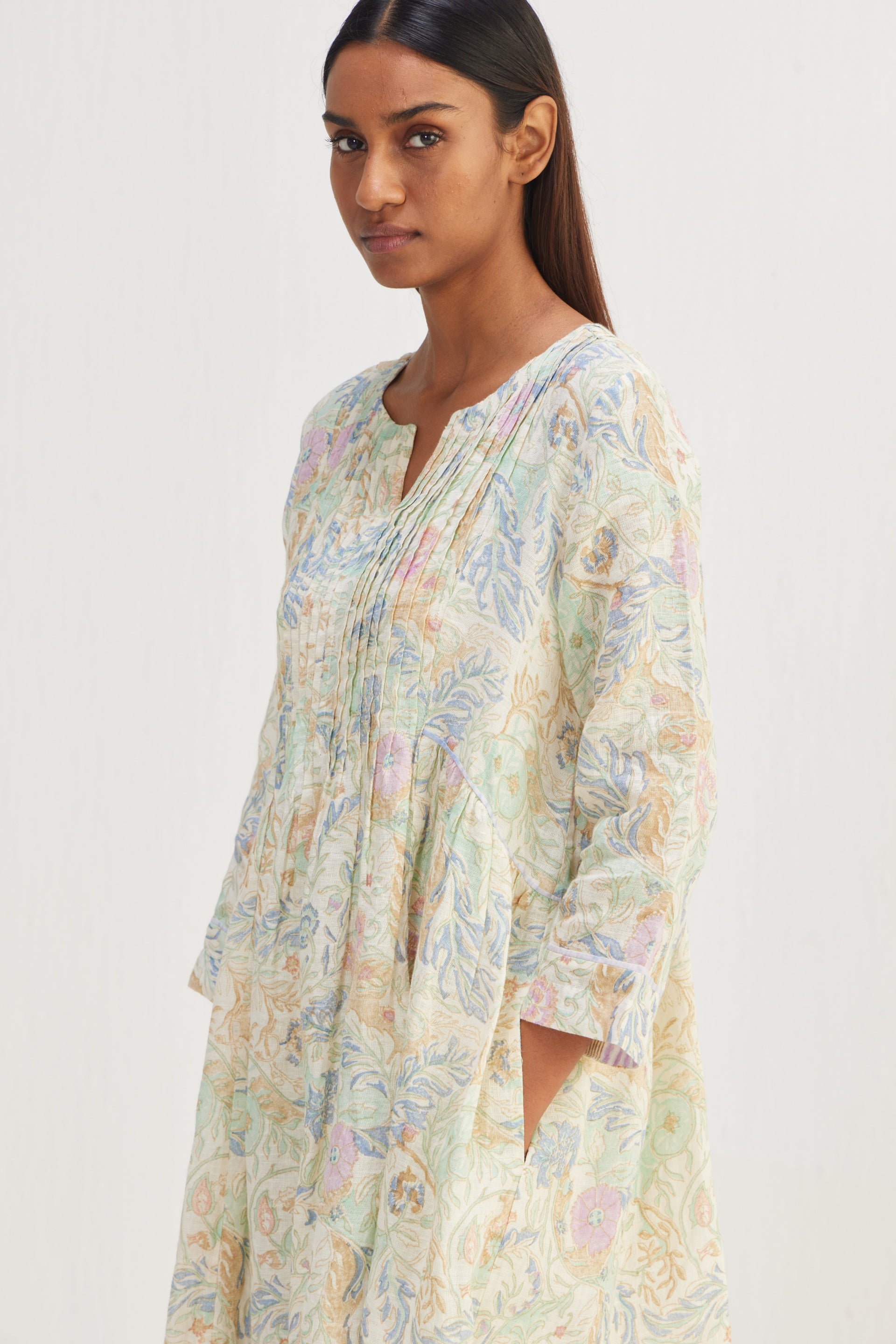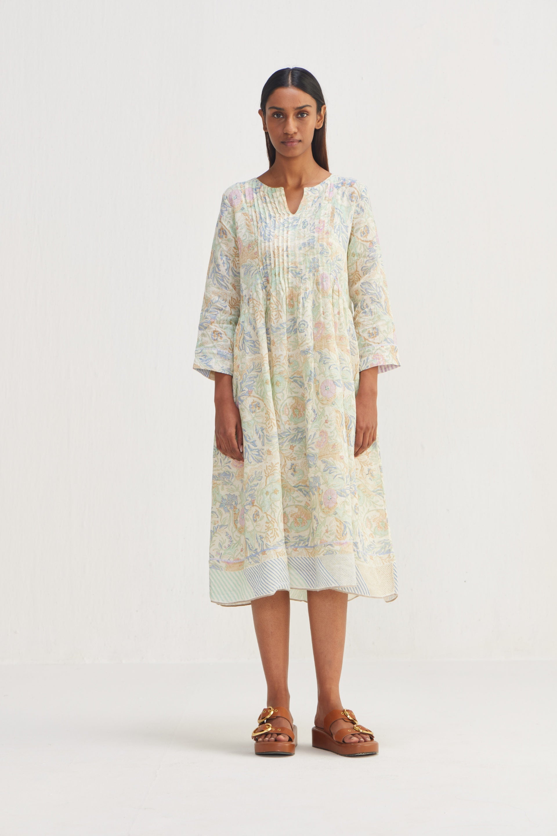 Midi dress with all round pintucks in all over hand block floral print with contrast piping detail.