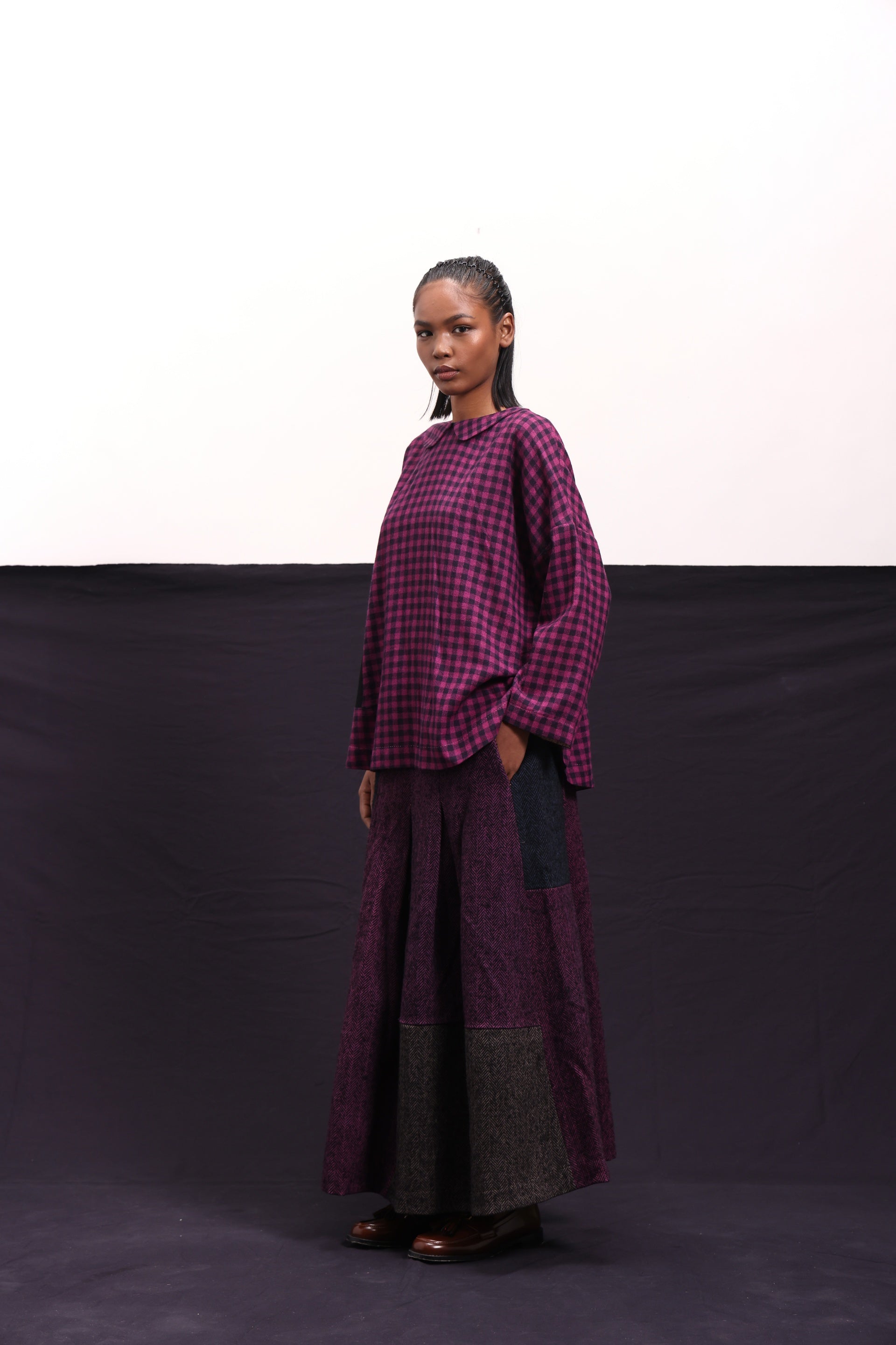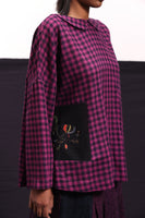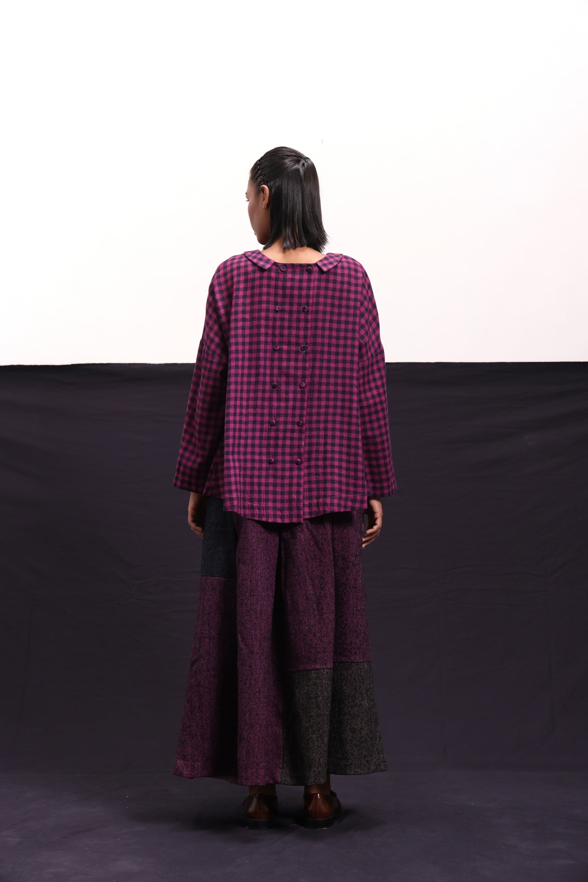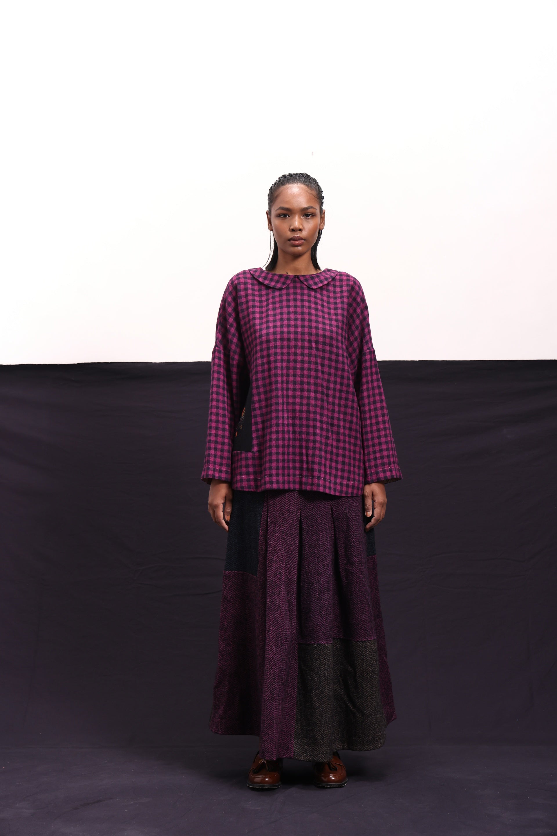 Top with peter pan collar and embroidered patch detail constructed in gingham checks wool.