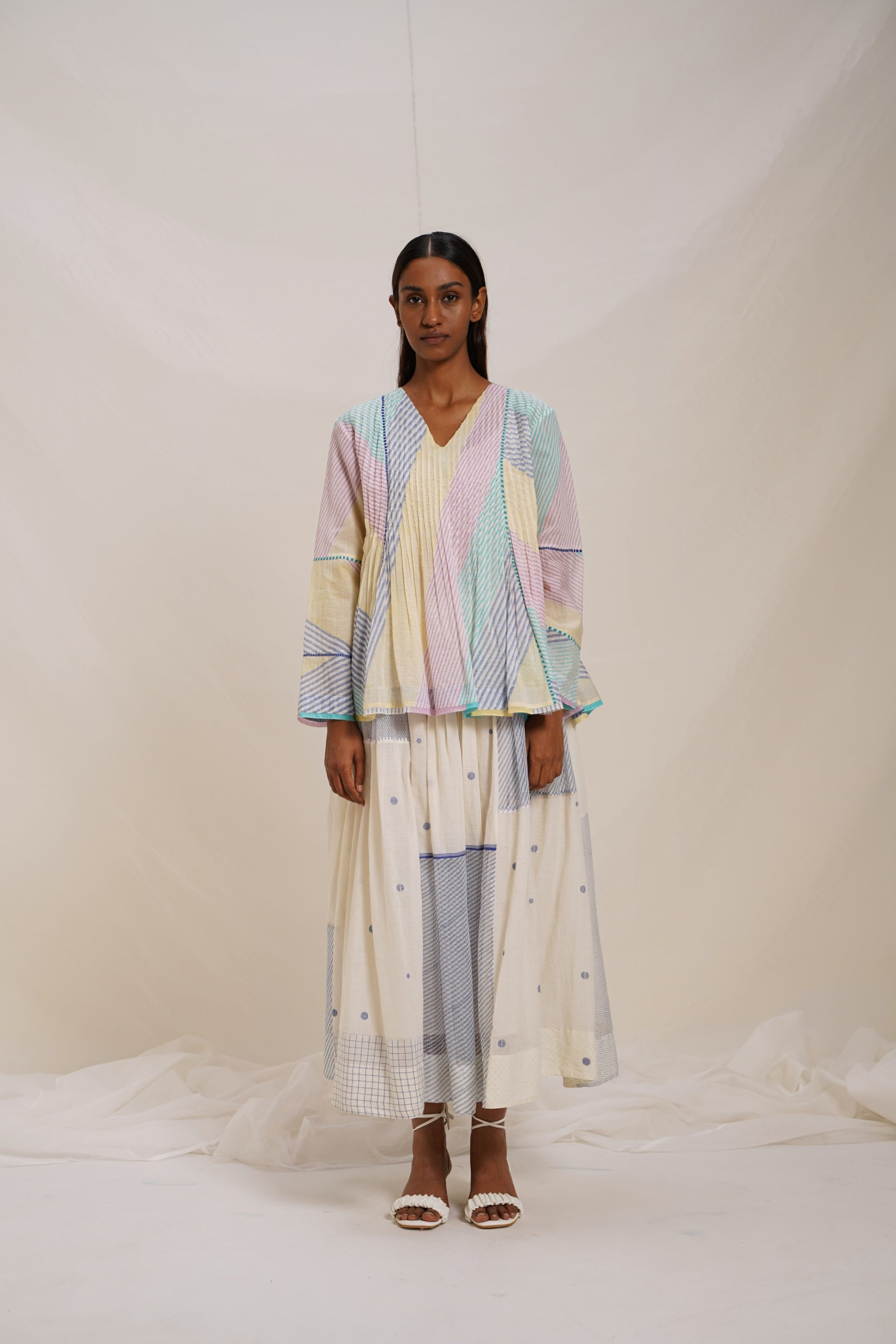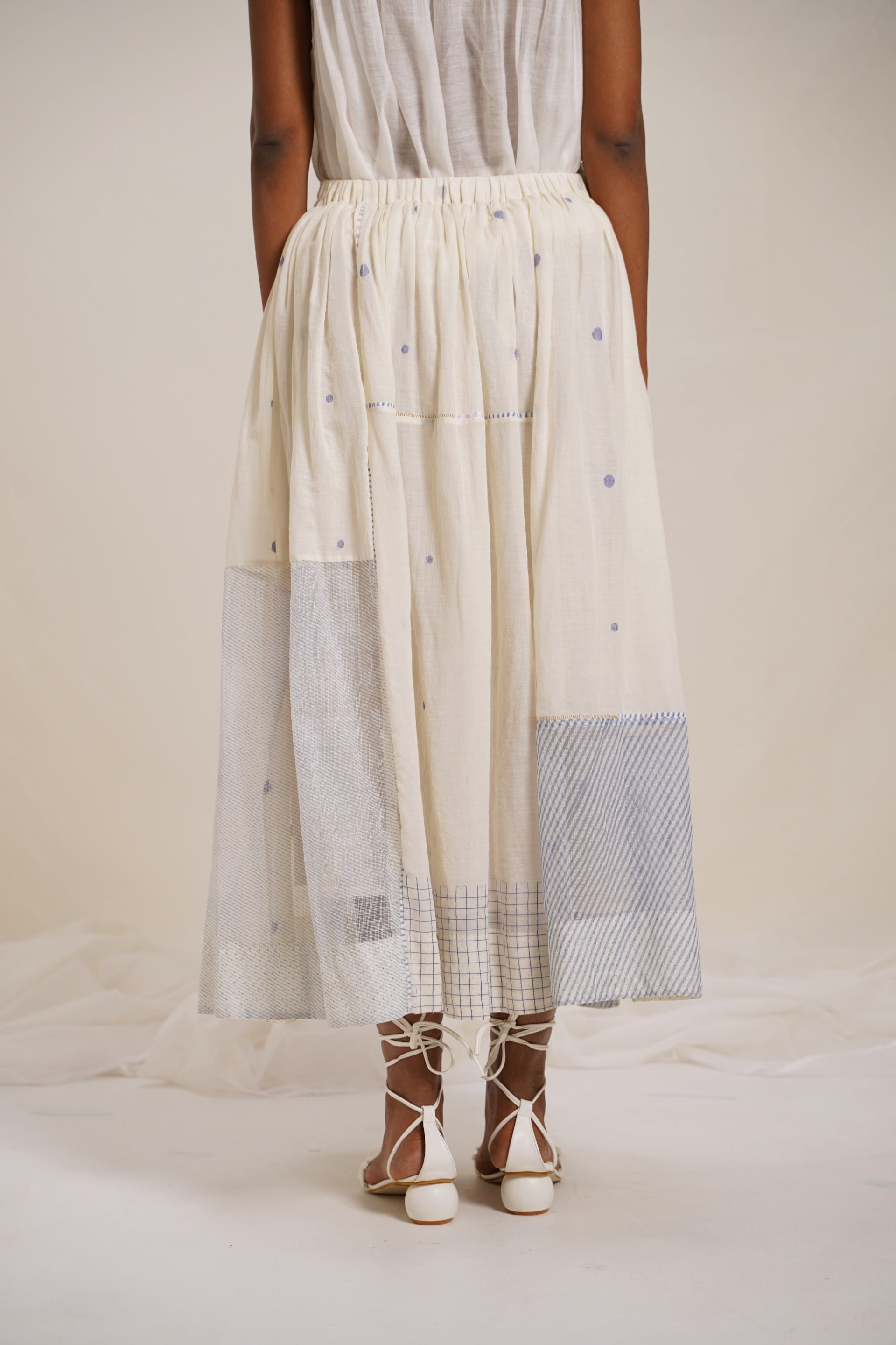 Gathered skirt, a stunning fusion of dot cotton Jamdani patchwork with a chic grid border and striper hand block print Kota Doriya. This piece comes complete with an attached text-printed lining for added flair and convenience.