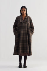 V- neckline tier midi dress front open button down with pin tuck detail on body and full puff sleeve .Constructed in striper 100% merino wool. Finished with contrast handblock print piping detail and collage handblock print 100% silk fabric facing detail.