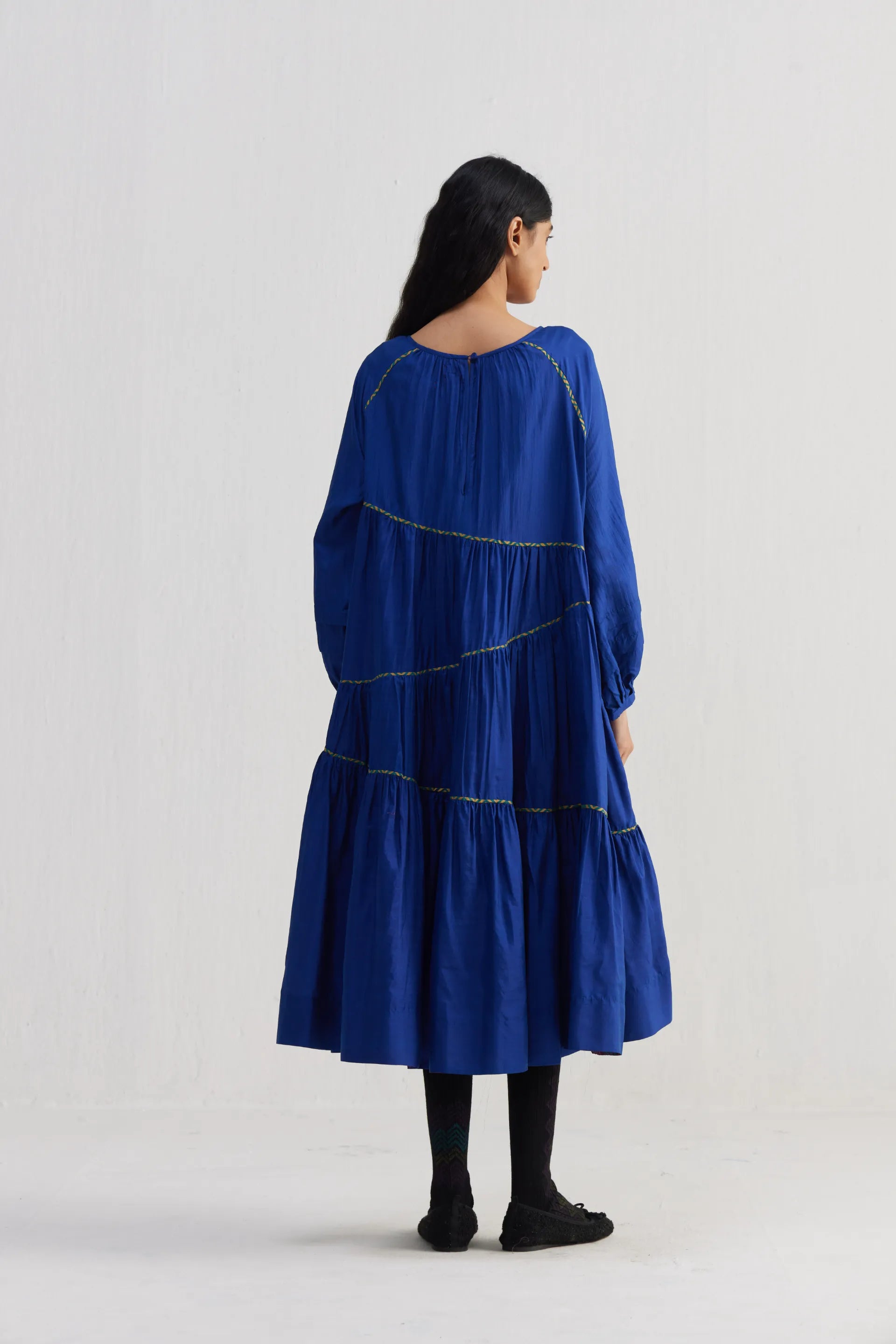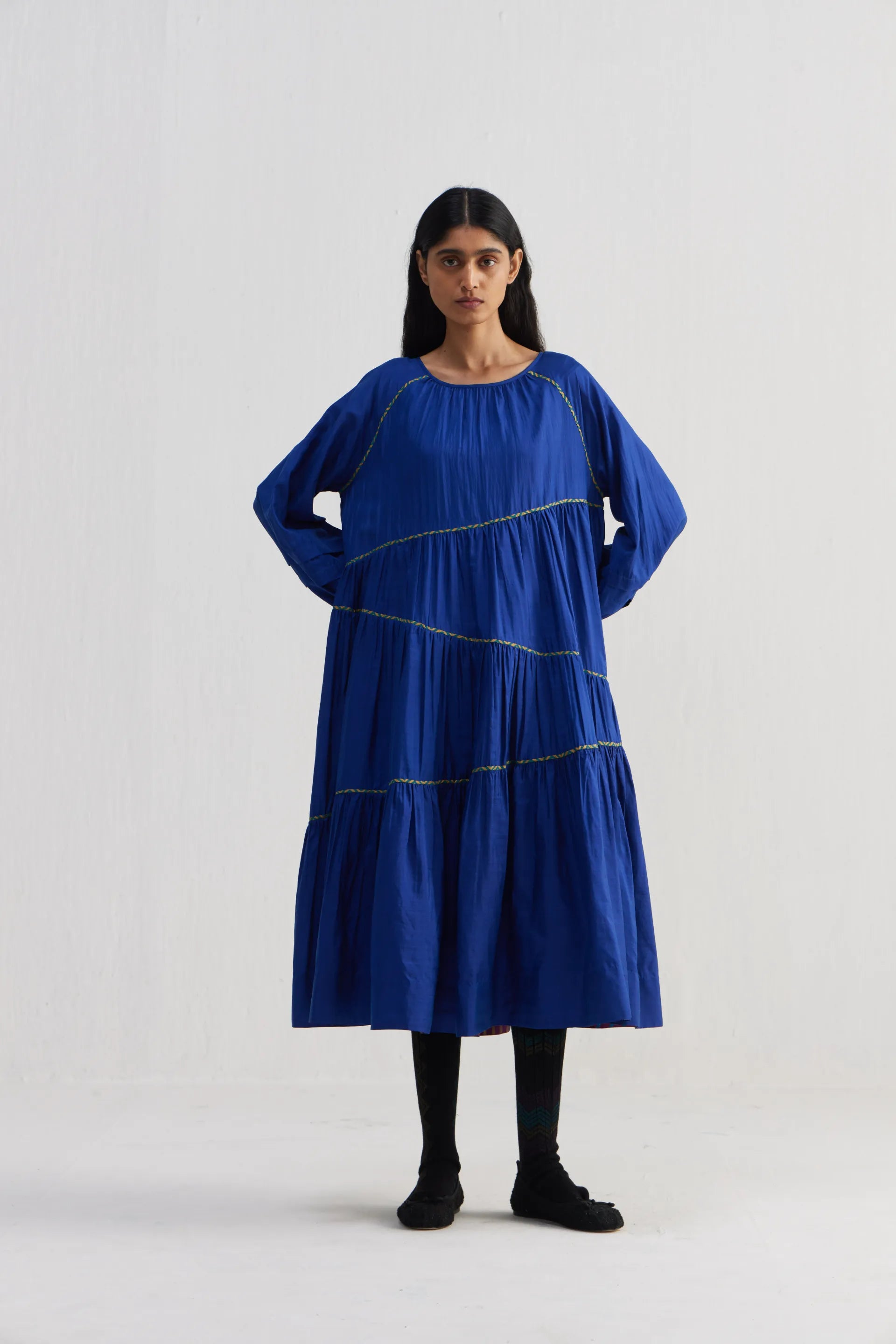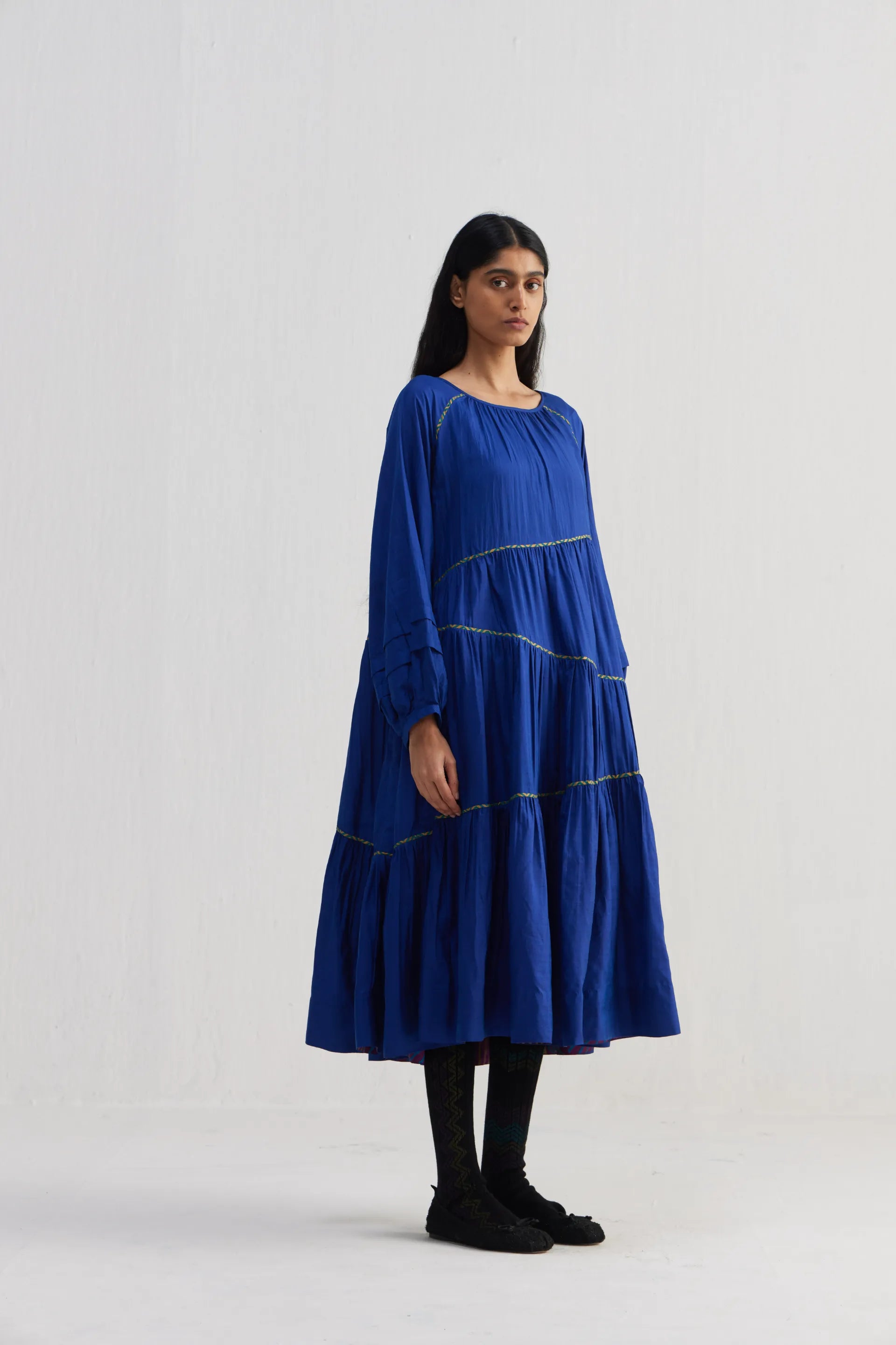 Round neckline raglan sleeve asymetrical tier maxi dress with tuck deatil on full puff sleeves and back button closure detail. Constructed in solid 100% silk fabric. Finished with contrast handblock print piping detail and collage handblock printed 100% silk fabric facing detail.