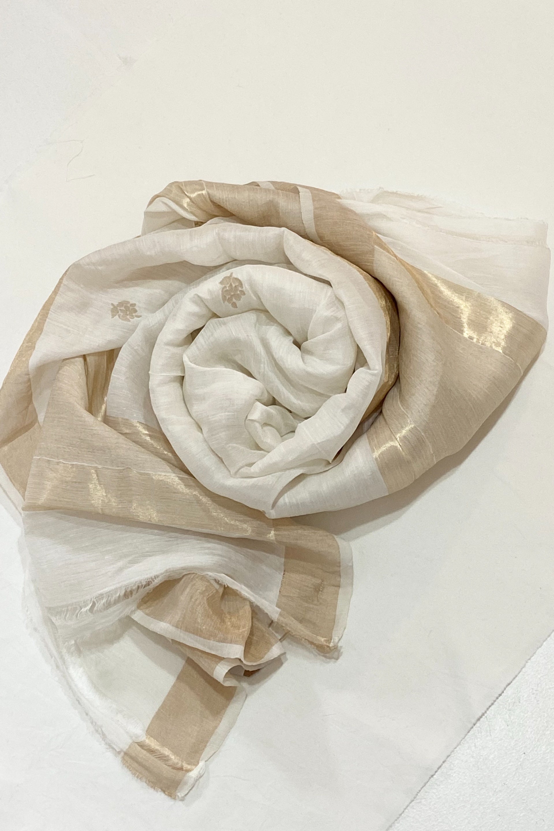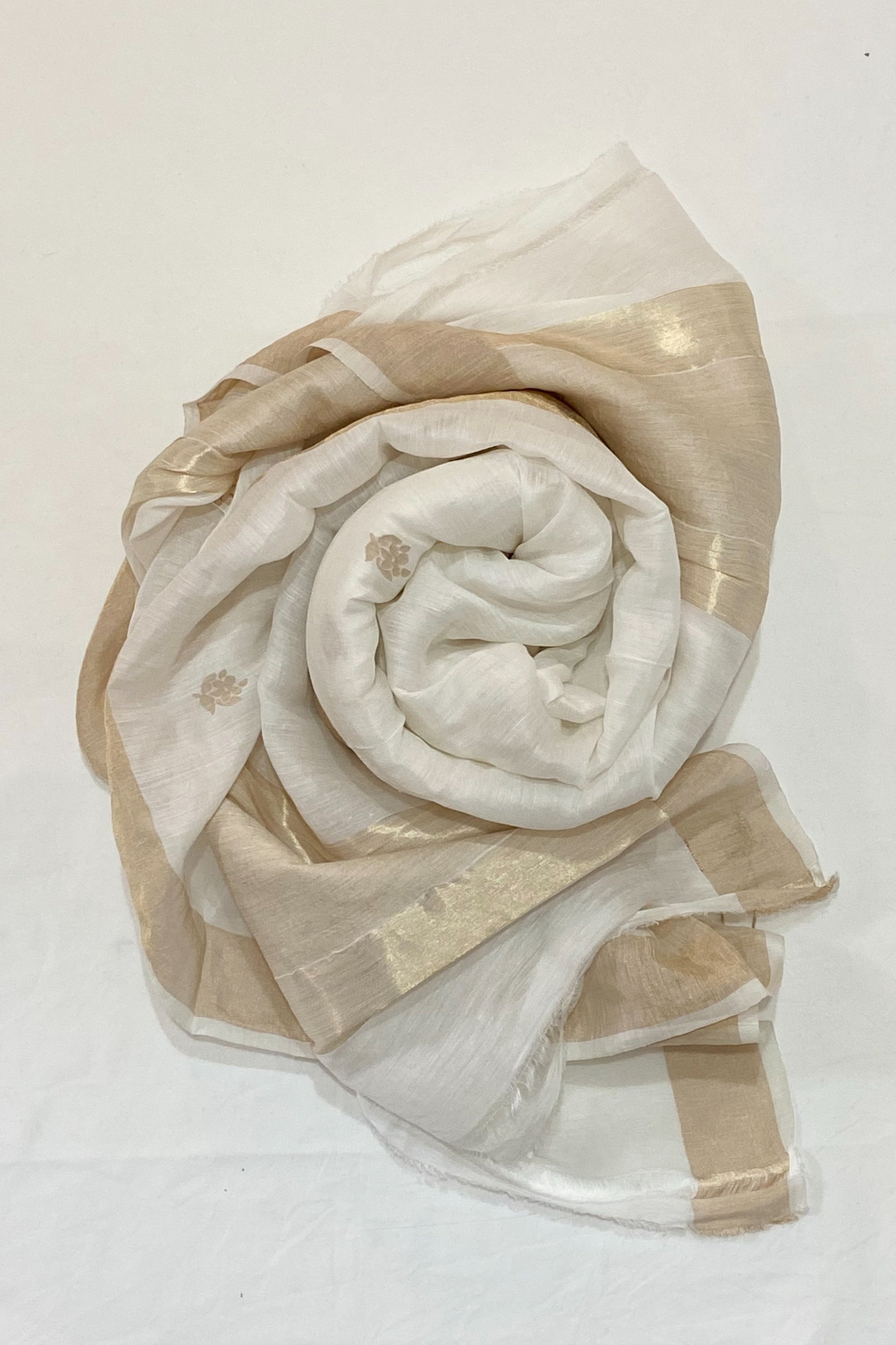 White linen zari stole with gold zari border detail